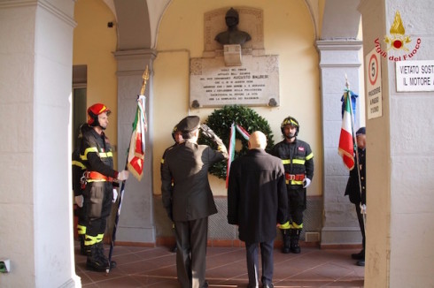 Prima della funzione religiosa era stata depositata una corona alla lapide che ricorda il sacrificio del vice comandante Augusto Baldesi, deceduto nel 1920 durante le operazioni di spegnimento di una polveriera nel quartiere di San Gervasio e con lui quello di tutti i vigili del fuoco deceduti in servizio.