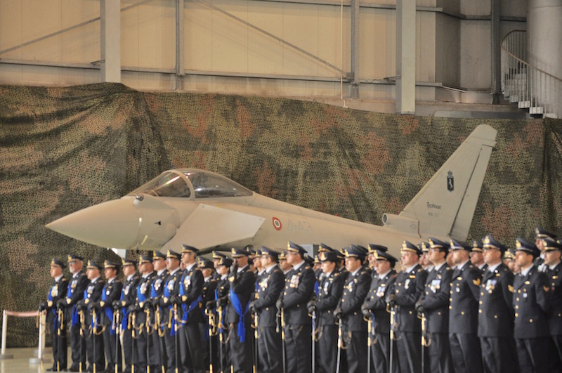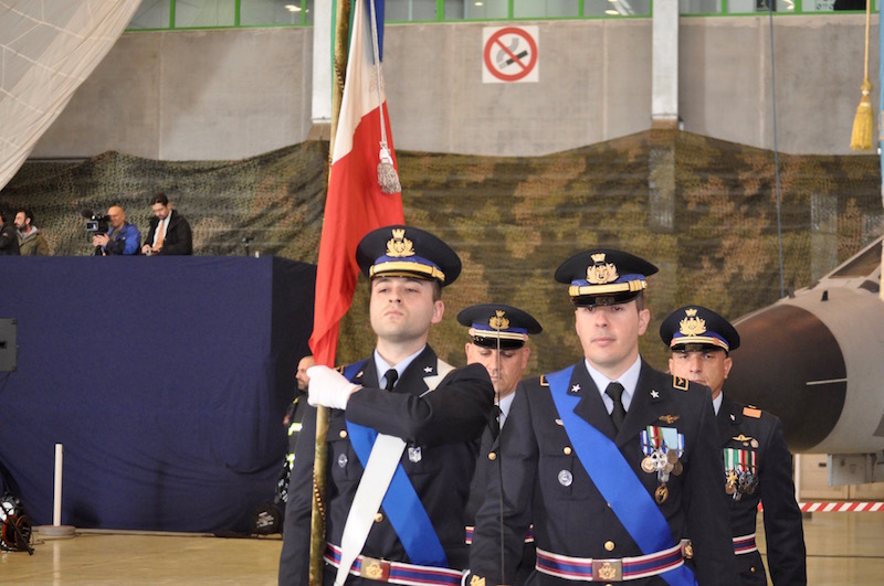 All’interno dell’hangar, dove tra gli altri c’erano due velivoli da caccia, un Tornado e un Eurofigher, gli onori sono stati resi da un reparto di formazione comandato dal generale Fabio Giunchi accompagnato dalle note della Banda musicale dell’Aeronautica djretta dal tenente colonnello maestro Patrizio Esposito.