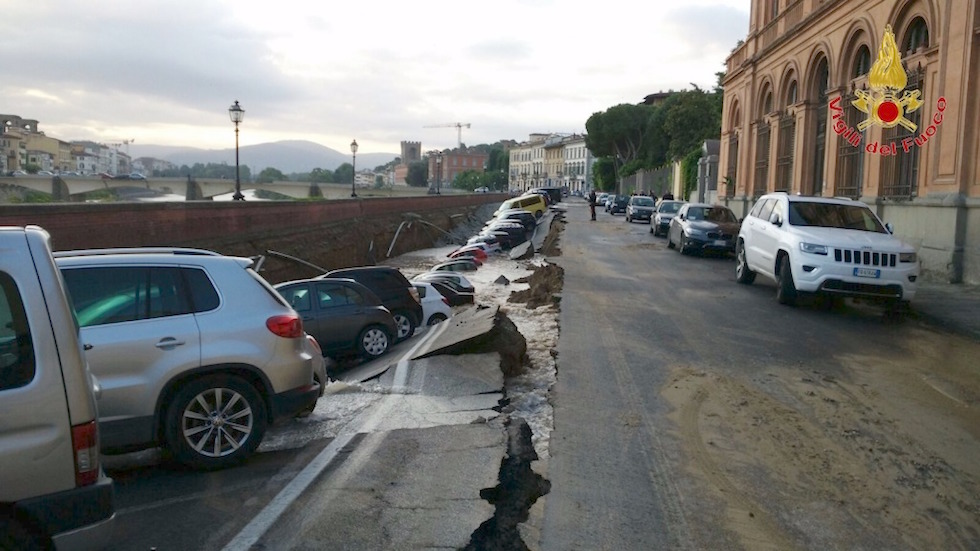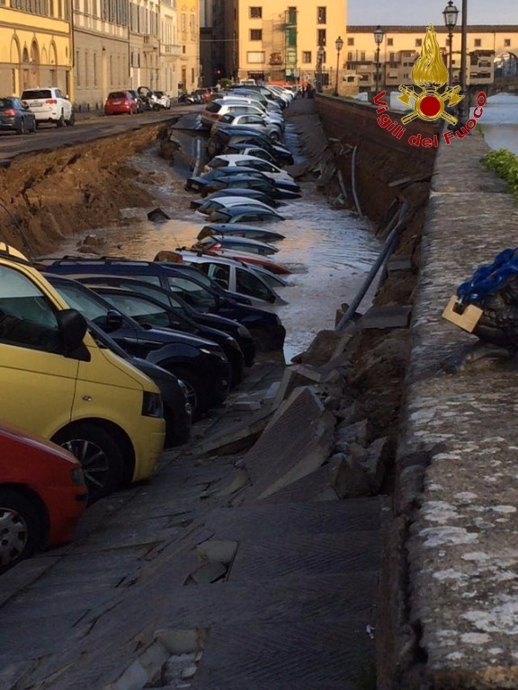 L’argine del lungarno ha per fortuna retto, altrimenti le autovetture – in sosta lungo la carreggiata destra – sarebbero finite in Arno. Sul posto è arrivato anche il sindaco di Firenze Dario Nardella.