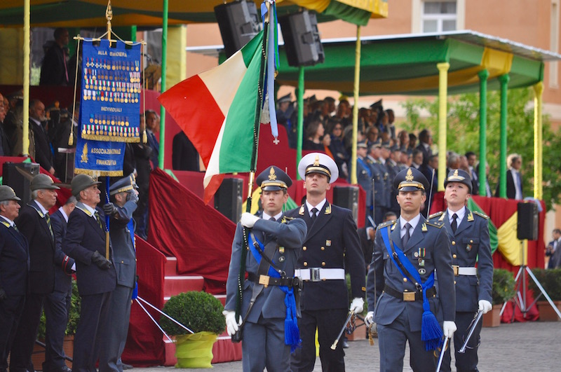 Una cerimonia semplice ma solenne all’insegna dell’essenzialità, che si è svolta nel piazzale della Caserma Piave di Roma. Tra i presenti i ministri dell’Economia e delle Finanze Pier Carlo Padoan e quello dell’Interno Angelino Alfano e i vertici delle forze armate e dei corpi di polizia. Nel piazzale un battaglione di formazione delle varie specialità del Corpo, comandato dal colonnello Mario Salerno e accompagnato dalle note della Banda della Guardia di Finanza.