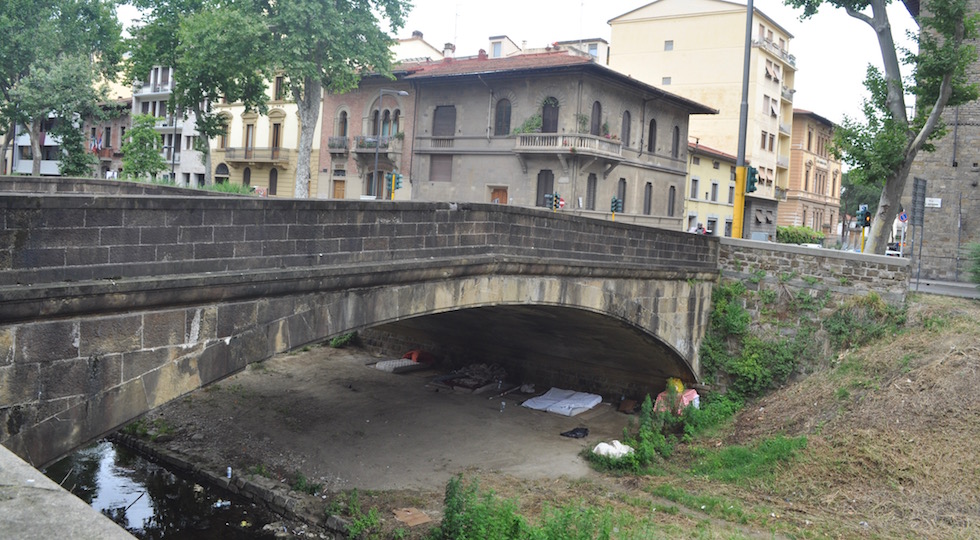 FIRENZE – C’è un accampamento di nomadi sotto un ponte lungo il torrente Mugnone a Firenze. Un luogo inequivocabilmente alluvionale, trattandosi dell’alveo di un corso d’acqua. In pieno centro cittadino tra via XX Settembre e viale Milton, a poche decine di metri da piazza della Vittoria dove c’è il liceo classico Dante, ormai noto anche per essere stato frequentato nei primi anni ’90 dal futuro premier Matteo Renzi. Una zona «bene» con molti palazzi eleganti e pochi negozi.