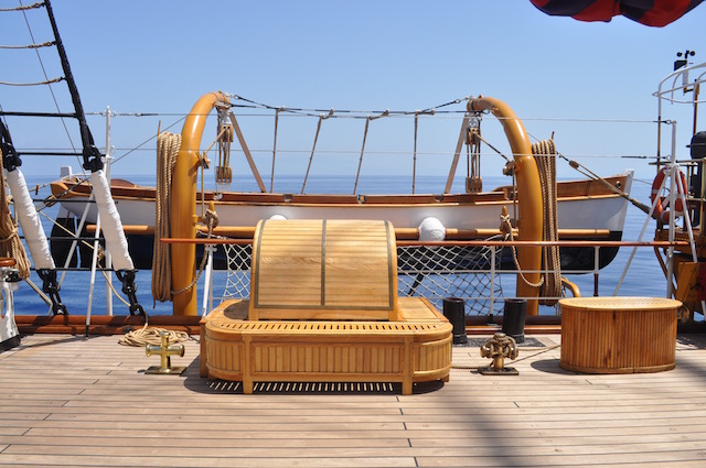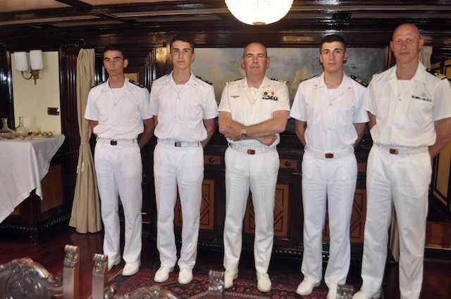 NAPOLI – L’hanno da sempre chiamata il veliero più bello del mondo. Ma a buon diritto la nave scuola Amerigo Vespucci può considerarsi anche l’ambasciata più bella del mondo. «Qui siamo in territorio italiano in qualunque porto estero ci fermiamo. In questa sala sono avvenuti incontri diplomatici a livello internazionale» dice con soddisfazione e orgoglio tutto marinaresco il capitano di vascello Curzio Pacifici, attuale comandante della nave. Ha voluto incontrare a pranzo proprio qui nella Sala del Consiglio piena di storia e di tradizioni, a poppa del veliero, il capocorso e i due capiclasse della Scuola Navale Morosini di Venezia, imbarcati sul Vespucci con i loro colleghi – tutti tra 17 e 18 anni – del Corso Nereus per un periodo di formazione in mare al termine dell’anno scolastico 2015-2016. Sono impeccabili i giovanissimi allievi nelle loro divise bianche e per nulla in difficoltà nel dover rispettare le severe regole del galateo: con le posate da mettere nella posizione giusta al momento giusto, mentre in tavola arriva pane che non fa briciole e frutta da non tagliare con il coltello.