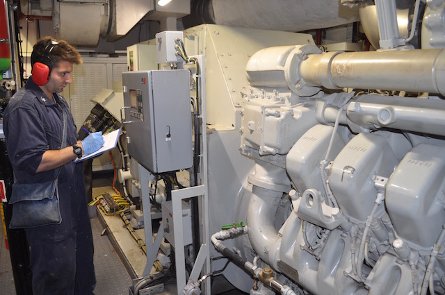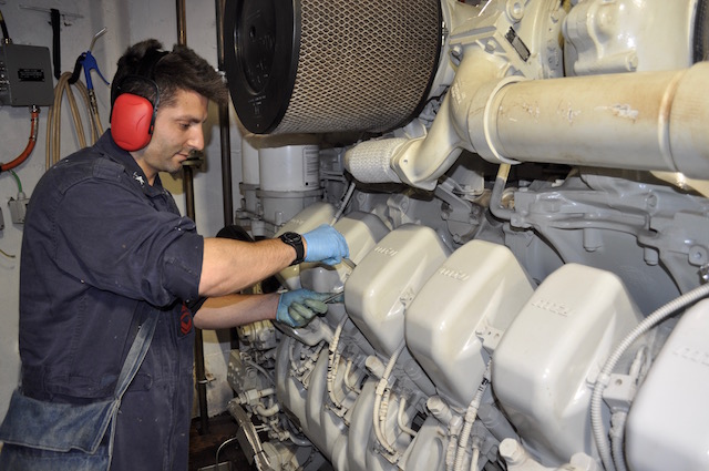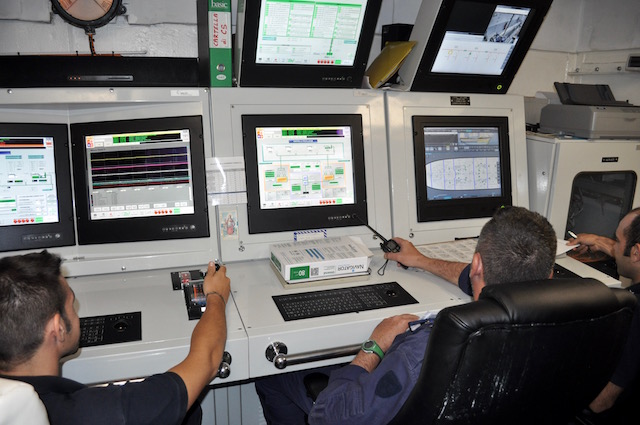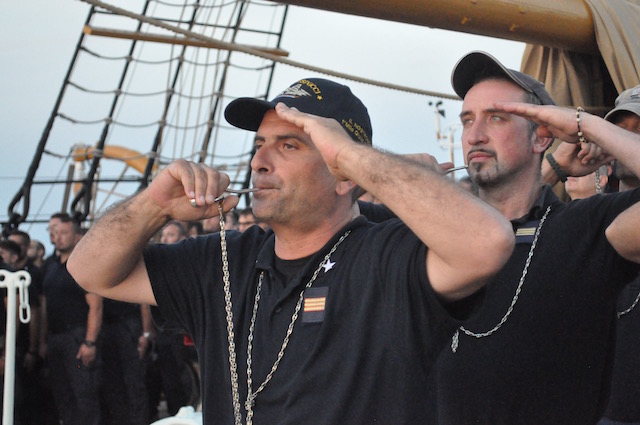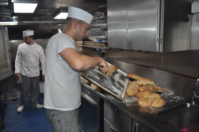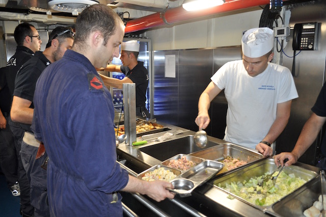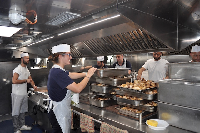 EQUIPAGGIO – Se potesse ogni marinaio avrebbe una storia da raccontare. Come il nostromo, 1° maresciallo Giulio D’Elia, memoria storica della nave che ha ancora negli occhi il giro del mondo effettuato in 17 mesi dal maggio 2002 al settembre 2003. Con una tappa, sulla via del ritorno dall’Australia, che solo quella durò ben 31 giorni di navigazione non stop. Come i responsabili della cucina (struttura vitale per la nave, quanto la plancia di comando) capo di 1ª classe Antonio Calò e 2° capo Nicola Valdettaro che con i loro collaboratori devono essere pronti a preparare quasi mille pasti al giorno. Come i marinai che si alternano nei turni della Centrale di Sicurezza (Cs), da dove in ogni momento delle 24 ore si tengono sotto controllo tutti gli apparati meccanici ed elettrici della nave. Un lavoro silenzioso ma altrettanto vitale, tra generatori di propulsione e di corrente nel cuore nella nave, dove non c’è tempo per vedere la luce del sole.