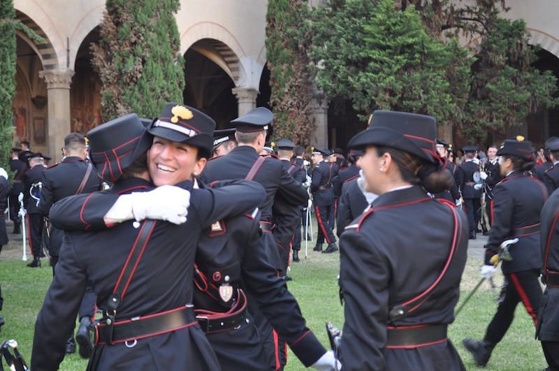 AMMAINABANDIERA – Alle 19,04 il momento più solenne della cerimonia. Dopo 96 anni viene ammainata la Bandiera tricolore che il 1° settembre sarà alzata nella nuova caserma di Castello. Sul prato del Chiostro Grande l’emozione è al massimo. Non solo tra i marescialli del reparto di formazione schierati agli ordini del colonnello Claudio Cappello (comandante del 2° Reggimento Allievi e prossimo comandante provinciale a Varese) ma anche tra le tante autorità e soprattutto le centinaia di familiari e parenti dei «neo promossi», arrivati da ogni parte d’Italia. Tutti reggono la commozione, fino però al «rompete le righe» quando finalmente viene concessa la libera uscita anche per qualche lacrima.