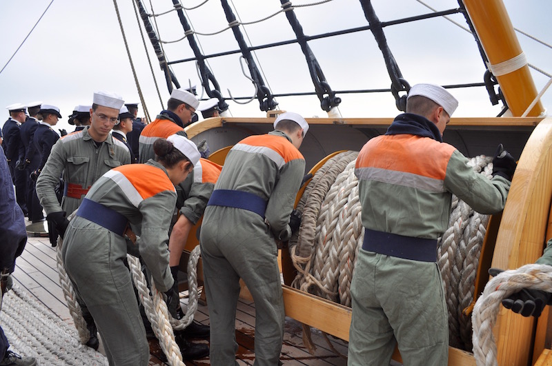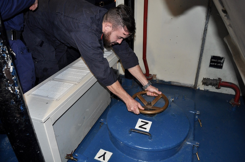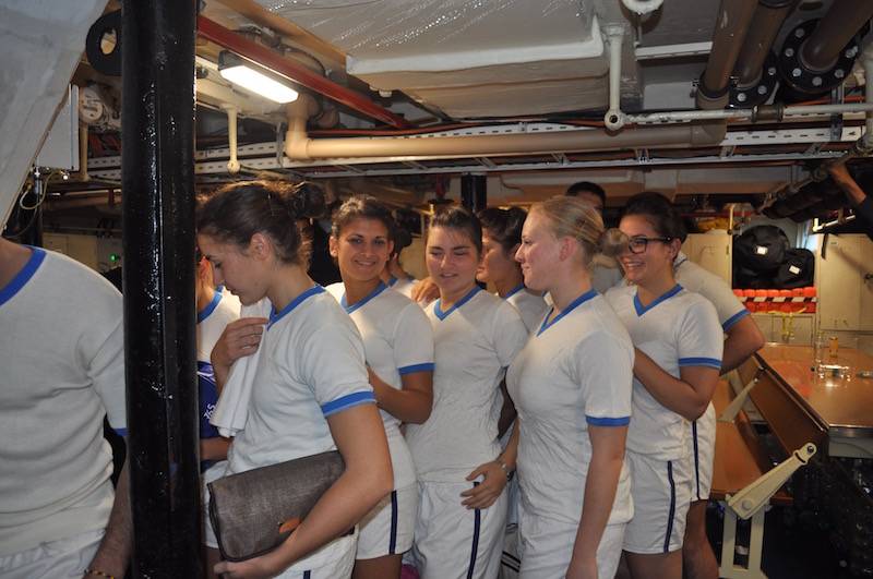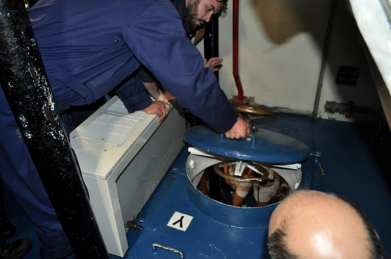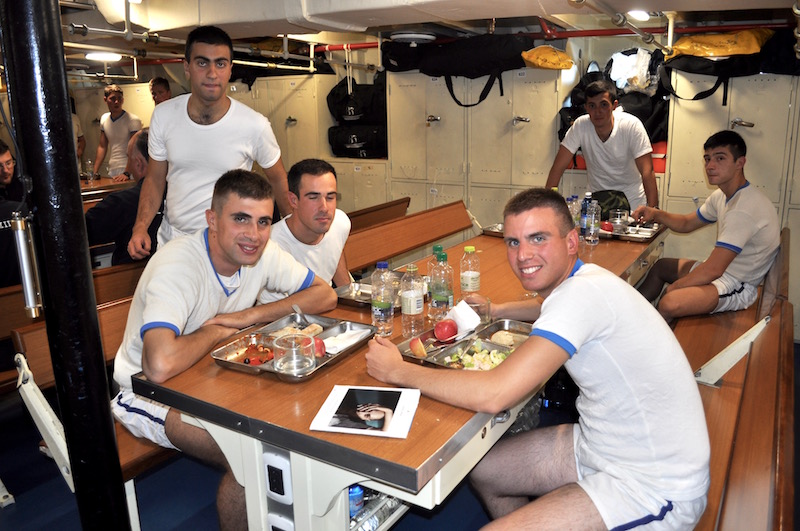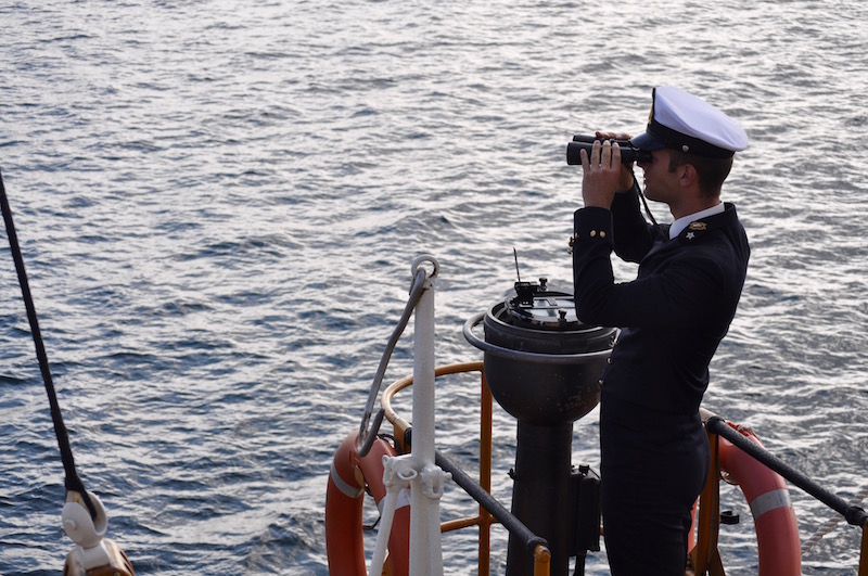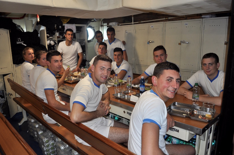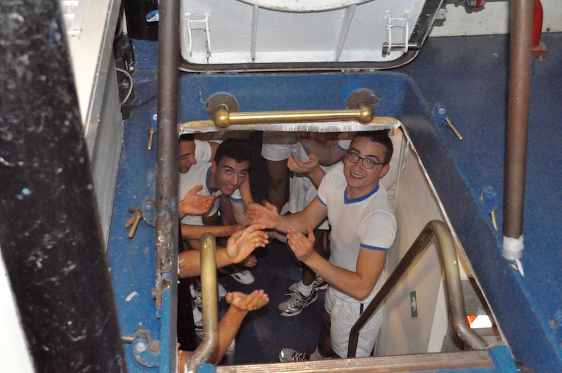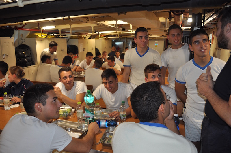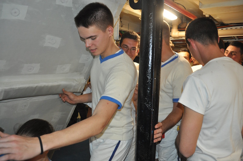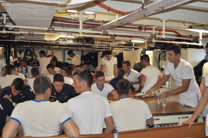 Ore 12,44 di oggi 31 agosto, tre ore dopo aver lasciato il porto di Copenaghen con rotta verso nord ovest. Sopra le loro teste si chiude il portellone che li separa dai cosiddetti «locali di vita», a bordo del Vespucci, dove studiano e mangiano. Vi dormono anche, naturalmente per le poche ore che restano dell’intensa giornata di campagna addestrativa.
