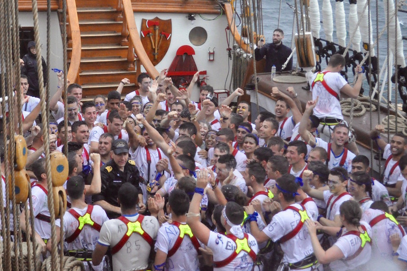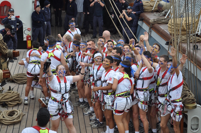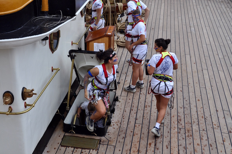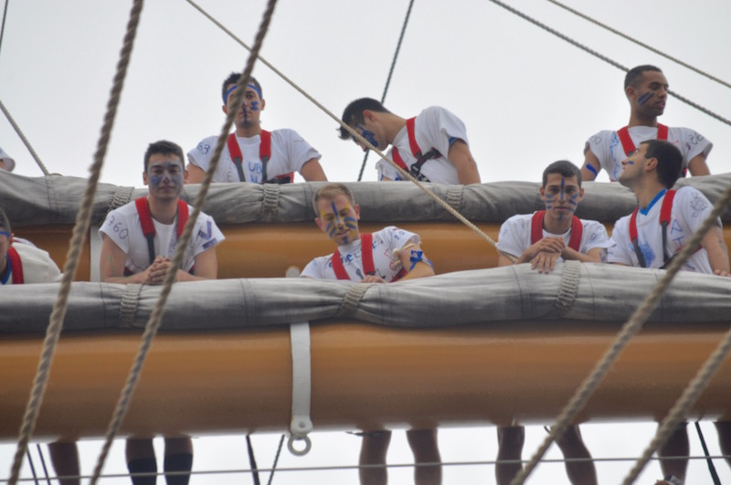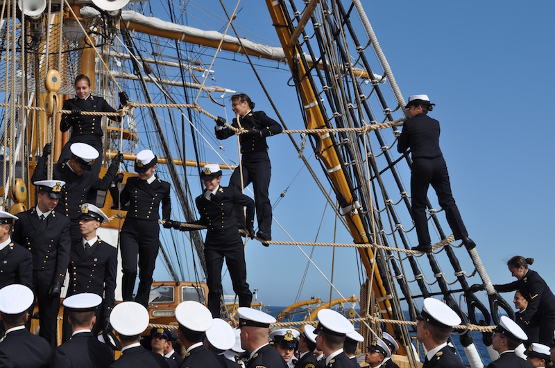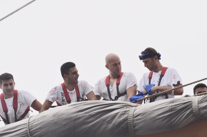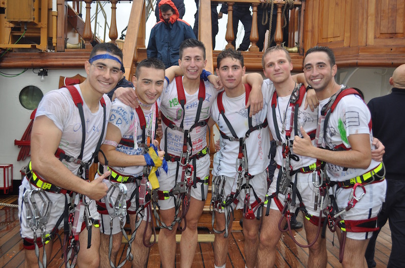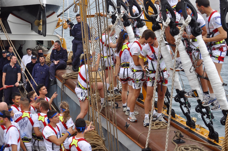 CONCLAVE – Per decidere il nome che salderà la loro appartenenza per tutta la vita militare (e anche dopo), i 100 allievi sono rimasti per due giorni e due notti in «conclave» in un locale non più grande di 100 metri quadrati. Un metro quadrato a testa, centimetro più centimetro meno. La stanchezza e la tensione si dissolvono però in un attimo a contatto con l’aria di mare e il vento a 20 nodi. Come veri e propri ragni i futuri ufficiali di Marina salgono rapidamente sull’albero più alto del Vespucci, sotto l’occhio vigile dei nocchieri della nave. È il momento tanto atteso fin dal primo giorno di Accademia, un anno fa esatto.