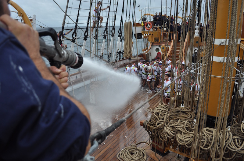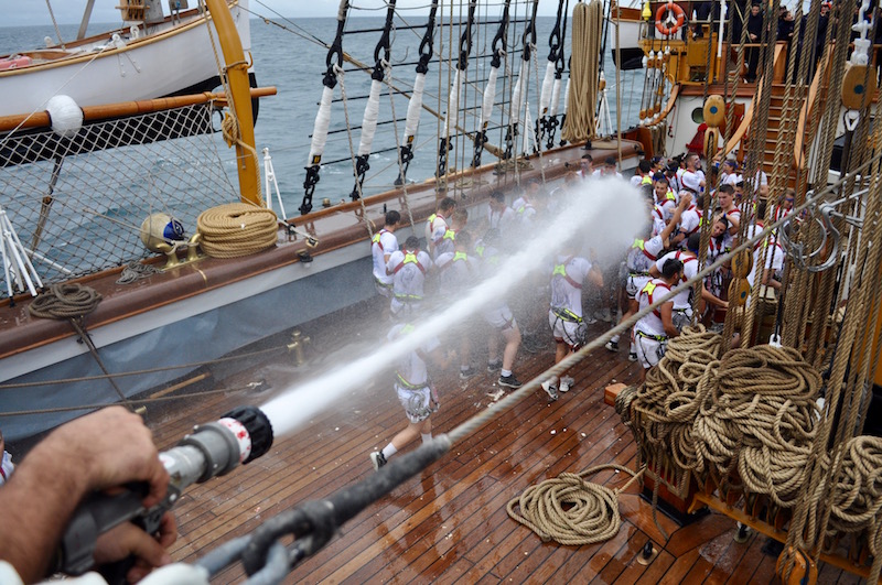 MOTTO – Non manca il motto: «Ubi alii vitant, intrepidi pugnamus». Dove gli altri fuggono, noi intrepidi combattiamo. Un impegno di serietà e di compattezza che, preso a 20 anni, è di buon presagio per il futuro. Il maltempo grazia il corso Ateires della pioggia, nonostante un cielo grigio tutto nordico e poco promettente. Ma in compenso, alla discesa dai pennoni, ad attendere gli allievi ci sono abbondanti getti d’acqua (salata naturalmente) da due pompe antincendio, che non risparmiano nessuno. Comandante alla classe compreso. Una tradizione anche quella per il battesimo del corso e … purificatrice al tempo stesso, dopo la clausura di due giorni sottocoperta e l’urgenza di una doccia. Calda o fredda, dolce o salata, non è poi determinante.