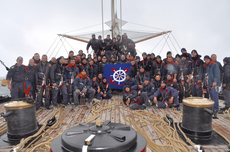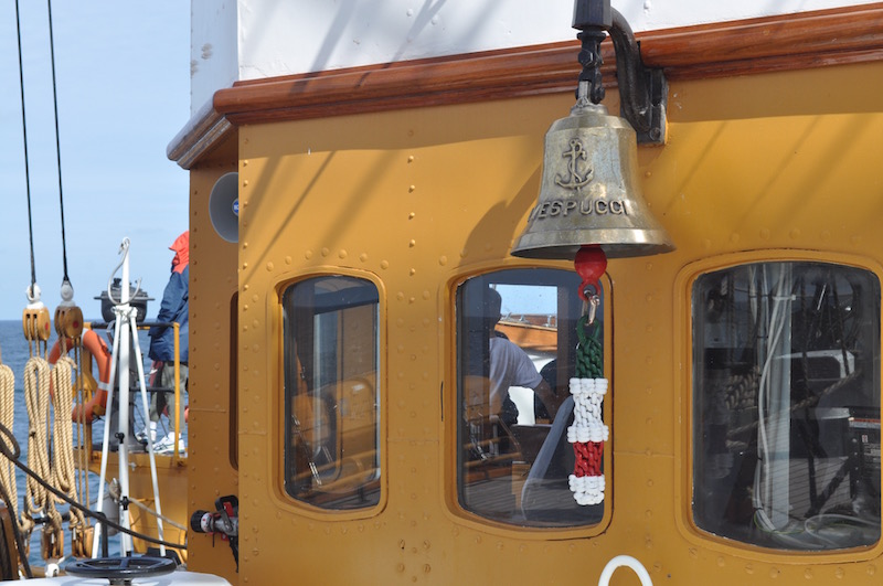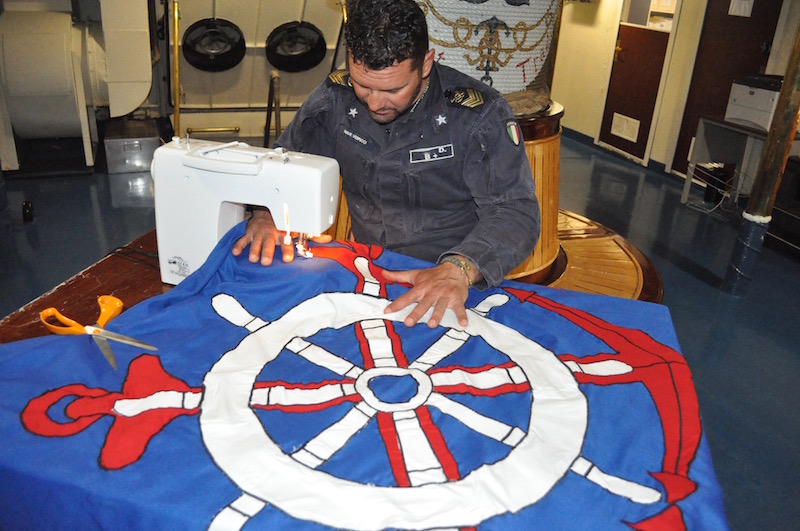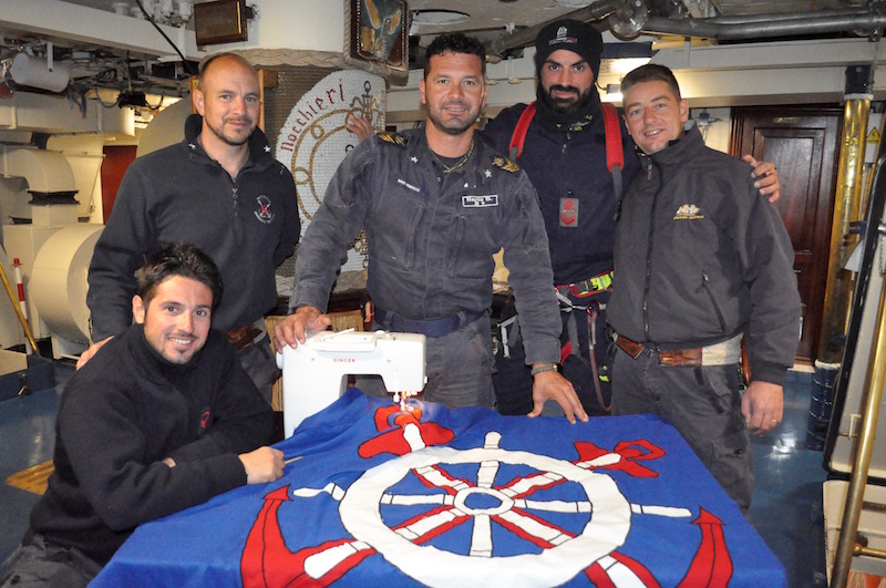 Sono oltre 90 persone, guidati dal nostromo Giulio D’Elia, il maggior numero della categoria imbarcata su una stessa unità della Marina. Un traguardo significativo per chi fa il nocchiere e un orgoglio al tempo stesso. Tanto è vero che proprio in questi giorni di inizio settembre 2016, durante la navigazione nel mare del Nord, i nocchieri del Vespucci hanno cucito la loro bandiera. Un grande timone bianco che sovrasta due ancore rosse su sfondo blu. È il segno distintivo della categoria dei nocchieri, ma per quelli del Vespucci è la «loro» bandiera, issata nelle occasioni particolari sull’albero di Trinchetto della nave.