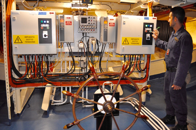 Oltre una cinquantina di marinai è impegnata giorno e notte nel «controllo della nave» : la sala regia è nella CS, la centrale di sicurezza che tiene sotto controllo tutte le parti elettriche e l’apparato motore. Scendere in sala macchine non è come prendere un ascensore, tra scalette e passaggi obbligati. Cuffie obbligatorie, si scopre un mondo sempre in movimento dove la luce del giorno e l’aria di mare è come se fossero distanti anni luce. Dalla sala dei nuovi generatori diesel che producono energia elettrica si passa a quella del Mep (il motore elettrico principale) che trasforma energia in movimento. Dal Mep parte l’asse lungo una decina di metri che fa girare l’elica. E qui la sorpresa, almeno per il cronista. La copertura dell’asse, che gira continuamente e che deve essere preservata da cadute accidentali di oggetti, o ancora peggio da infortuni, è formata da tante pedane di alluminio bianche, rosse e verdi. Un vero e proprio Tricolore italiano, voluto dai marinai del Vespucci, anche sotto il livello del mare. Una risposta indiretta, c’è da scommetterlo, ai colleghi che lavorano sopra coperta e che il Tricolore lo vedono sventolare ogni giorno sulla vetta dell’albero di Mezzana.