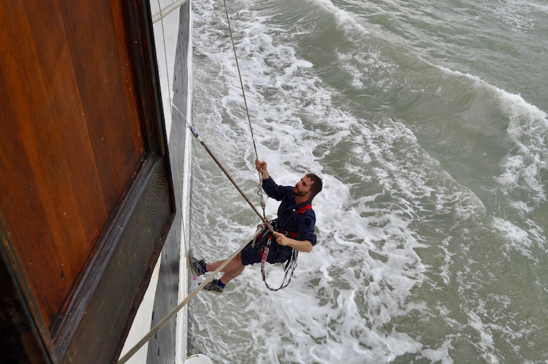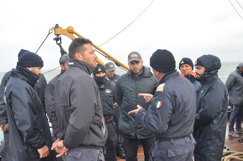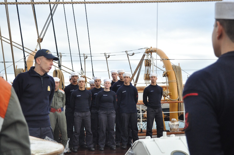 Ma come si svolge la giornata a bordo del Vespucci? La stiamo vivendo con i marinai fino dalla partenza da Copenaghen diretta ad Anversa. La sveglia equipaggio è alle 7, festivi compresi. Un quarto d’ora dopo inizia la colazione. Chi tarda rischia di rimanere senza. Alle 8.15 il comandante Curzio Pacifici riunisce il suo staff nella plancia, raggiungibile solo da due scalette esterne in verticale, che aiutano la ginnastica. Briefing sulle principali attività giornaliere, per non più un quarto d’ora. Ore 8,30 assemblea sul ponte di prora di tutto l’equipaggio della nave, con rapide comunicazioni e istruzioni da parte del comandante in seconda Ettore Ronco e dei vari capi servizio. Quasi in contemporanea c’è l’assemblea sul cassero degli allievi dell’Accademia Navale, diretta dal comandante alla classe Francesco Marzi e dai suoi sottordini. Nello stesso tempo il comandante della nave ascolta, nella saletta sotto plancia, l’aggiornamento delle previsioni meteo preparate dagli stessi allievi dell’Accademia, sotto la guida del capitano di fregata Nunziante Langellotto. I briefing finiscono rapidamente e subito dopo tutti i membri dell’equipaggio raggiungono posti e compiti assegnati. Li abbiamo seguiti.