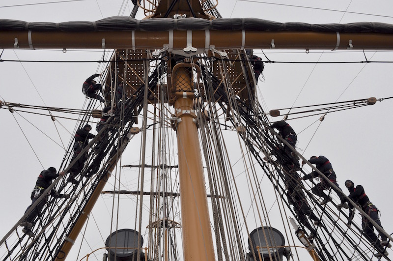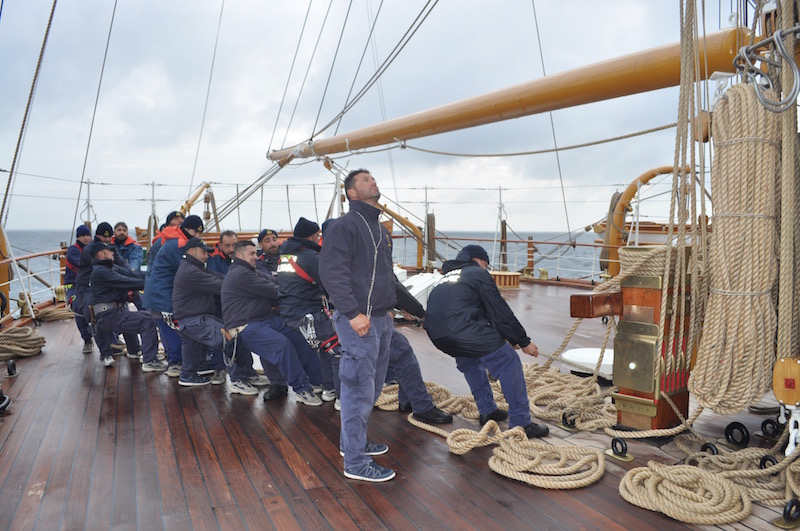 Lavoro non stop in qualunque ora del giorno e della notte. Chi «comanda» è il vento e il mare, con i quali non è permesso discutere ma solo assecondarli e, quando possibile, prevenirli. Una serie di fischi, ognuno con un significato, e subito la squadra di turno è pronta a gestire ognuna delle vele del Vespucci. Complessivamente sono 23 per circa 2800 metri quadri di tela in fibra vegetale, pari ad almeno 4 campi di tennis. Tutte fatte (e riparate quando serve) a mano. Come la bandiera dei Nocchieri del Vespucci.