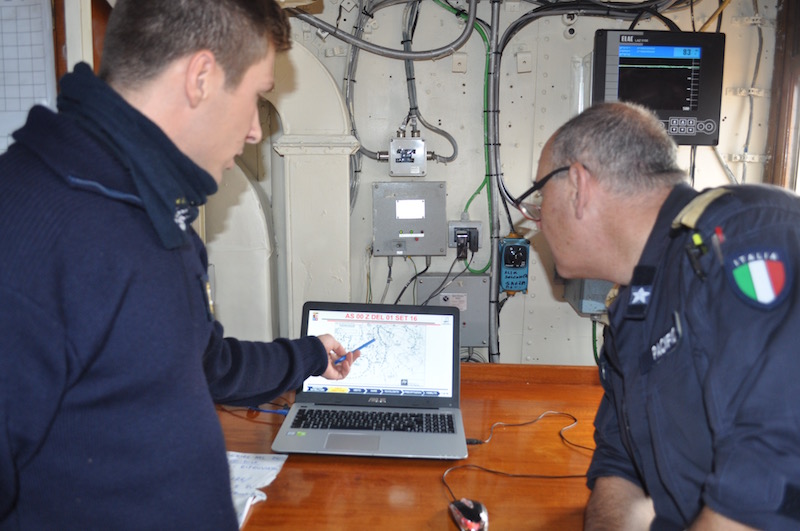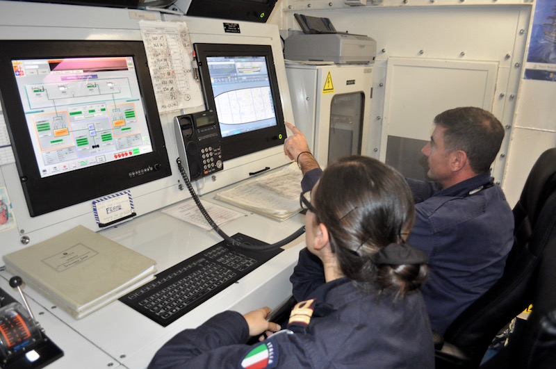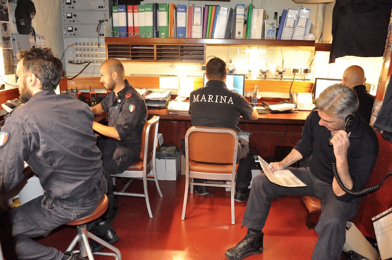 Dalla Sala Radio di bordo di prima mattina vengono passate al Comando tutte le comunicazioni arrivate durante la notte. Sulla porta c’è scritto «Area Classificata». Un campanello e una serratura a combinazione lo confermano. È quella che potrebbe definirsi «orecchio e voce» della nave: ricevere e trasmettere messaggi ovunque, via radio o via satellite.