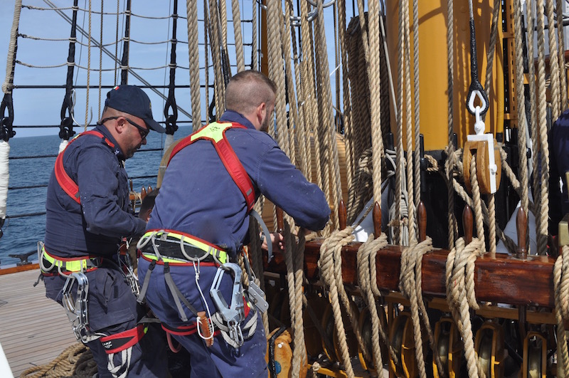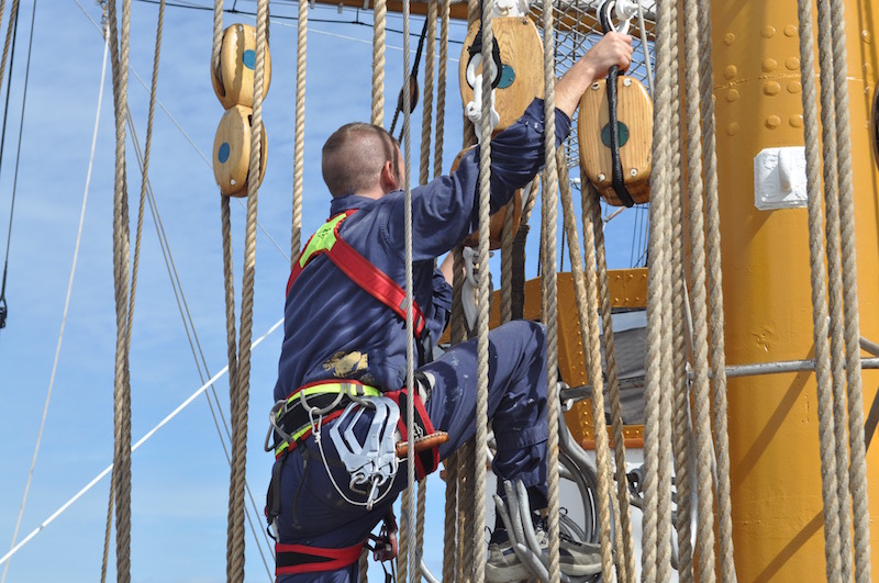 Alberatura e vele. Timoneria. Gestione di oltre 30 chilometri di cime. Turni di vedetta. Messa in acqua delle imbarcazioni di bordo (a motore, remi e vela). E anche, quando non ci sono gli allievi dell’Accademia, lucidatura dei tanti ottoni di bordo. Sono i compiti principali dei nocchieri, la squadra più numerosa dei marinai del Vespucci. Si occupano in pratica di tutto quanto succede sopra coperta.
