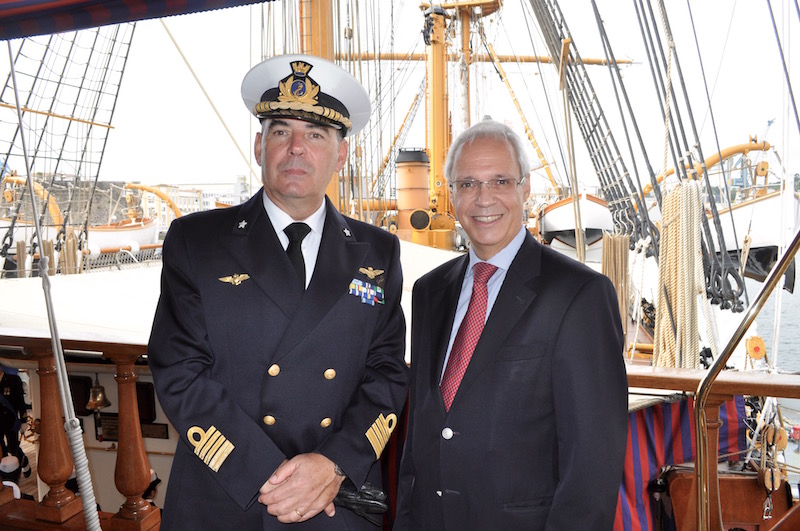 COMANDANTE – Prima della partenza da Brest, dove la città ha accolto con festa la sosta di Nave Vespucci (al Bureau du Tourisme sono state continue le richieste di informazioni sugli orari per visitarla), abbiamo chiesto al comandante di Nave Vespucci, il livornese capitano di vascello Curzio Pacifici, di tracciare un bilancio della navigazione e delle soste in importanti porti europei: dalle Baleari a Lisbona, da Cadice a Dublino, da Oslo a Copenaghen, da Anversa a Brest. «Siamo ormai a quattro quinti del nostro viaggio. Parlare di numeri è importante ma non certo esaustivo» premette Pacifici seduto nella prestigiosa Sala Consiglio a poppa del Vespucci, il luogo degli incontri di rappresentanza di quella che a tutti gli effetti è una prestigiosa ambasciata «mobile» d’Italia e strumento operativo anche della «Naval Diplomacy».