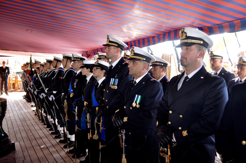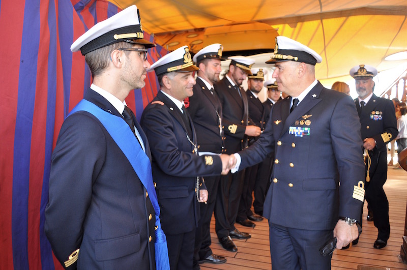 LIVORNO – «In nome del Capo dello Stato, riconoscerete come Comandante di Nave Vespucci il capitano di vascello Angelo Patruno». Sono le 9.56 di martedì 4 ottobre 2016. Il comandante uscente Curzio Pacifici pronuncia la formula di rito con cui cede il comando della Nave al suo successore. Sul cassero del Vespucci è schierato l’intero equipaggio che ha appena reso gli onori al contrammiraglio Enrico Pacioni, capo del Comando delle Forze di Contromisure Mine, in rappresentanza dell’Ammiraglio di Squadra Donato Marzano, Comandante in capo della Squadra Navale da cui dipende anche «la più bella nave del mondo».