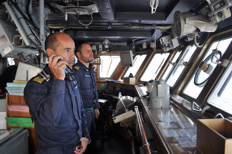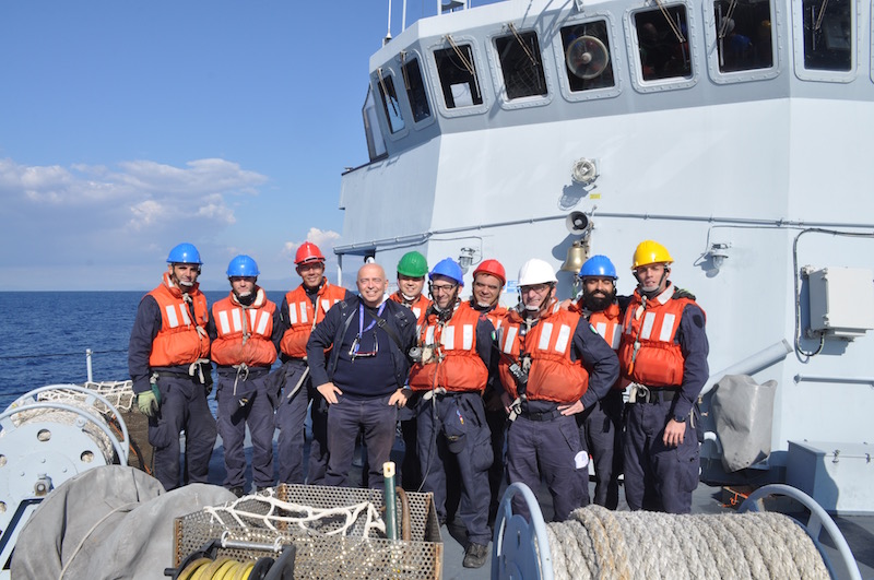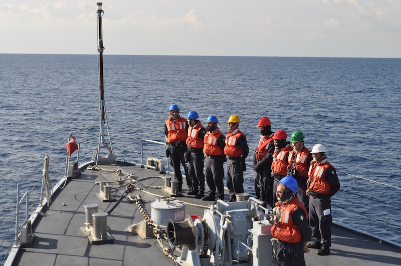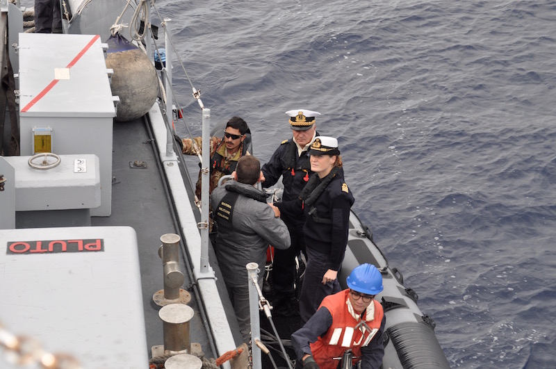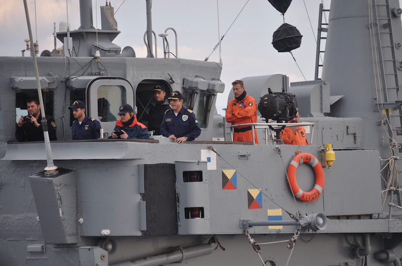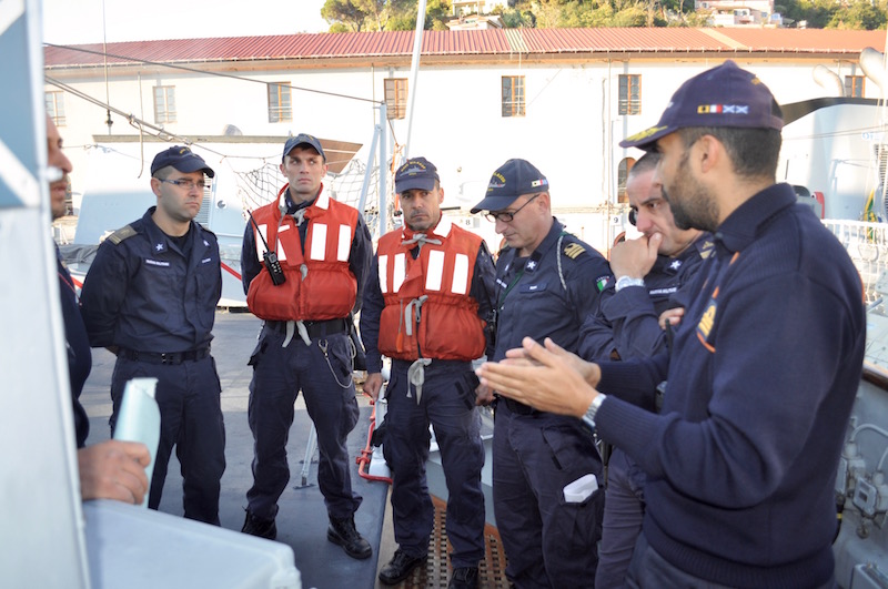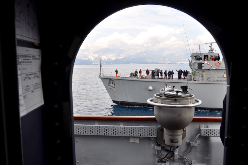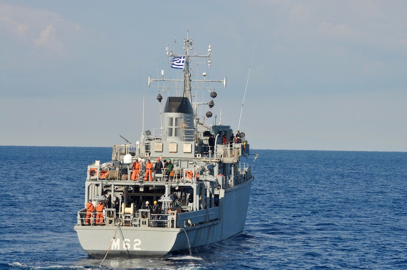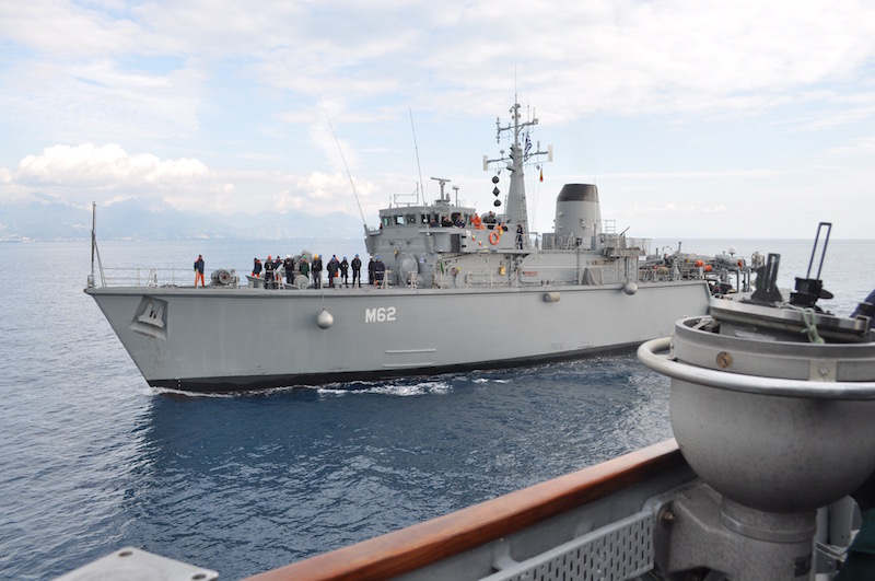 Durante la navigazione combinata del Milazzo e di nave Evropi, sale a bordo dell’unità italiana il contrammiraglio Enrico Pacioni, capo del comando delle forze di contromisure mine (Maricodrag), da cui dipendono la flotta dei cacciamine, dei mezzi navali idrografici e lo stesso Centro di addestramento. L’ammiraglio vuole rendersi conto di persona di come procede lo «stage» di Nave Evropi, guidata dal tenente comandante (in Italia sarebbe un capitano di corvetta) Konstantinos Nastoulis e che a bordo ospita un team di istruttori di Maricendrag.