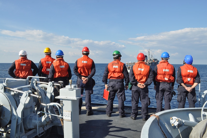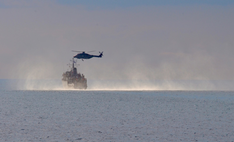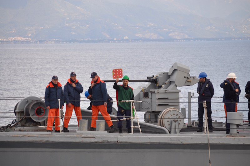 L’addestramento non conosce soste. Dal traino del Milazzo, che simula un’avaria, al passaggio di materiale tra le due navi affiancate. Dalla base di Luni arriva anche un elicottero NH90 della Marina, che fa calare un verricello sulla Evropi per ipotizzare un «medevac», un’evacuazione medica di un marinaio che necessita di un ricovero urgente in ospedale.
