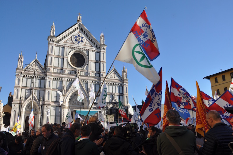 Una folla venuta in gran parte da numerose città italiane, da nord a sud. Centosettanta, secondo la questura, solo i pullman arrivati in città. Almeno 10.000 persone per la questura, 40.000 (ottimisticamente) per gli organizzatori. Contenuta invece la presenza di fiorentini. Finestre quasi tutte chiuse sulla grande piazza Santa Croce, quasi per non voler dispiacere all’altro Matteo, che Salvini – senza citarlo per nome – spesso chiama in causa come «il bugiardo patologico». Quello – incalza il leader della Lega – che toglie sovranità agli elettori. «Prima le province, ora il Senato. È il momento di restituire il voto agli italiani».