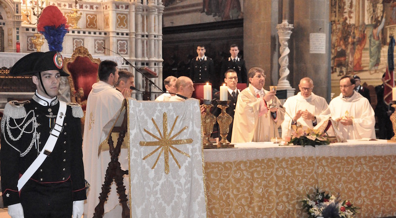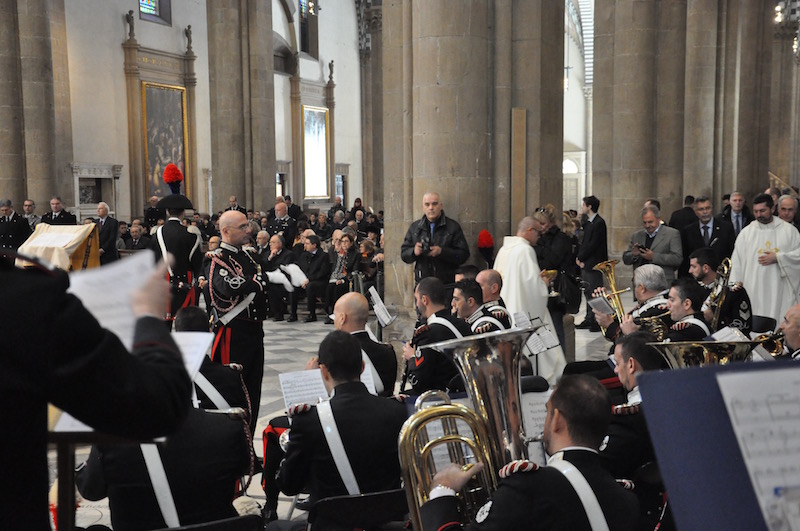 La messa solenne con il cardinal Betori è stata concelebrata da monsignor Mauro Tramontano cappellano della Legione Carabinieri, padre Cesare Bedognè cappellano della Scuola Marescialli, don Antonino Pozzo cappellano dell’Aeronautica militare per la Toscana, padre Antonio Idda parroco di Santa Maria Novella, don Francesco Marchi parroco di Santa Maria Madre di Dio (dove ha sede la nuova caserma di Castello), il maggiore dei carabinieri Ivano Vicini diacono permanente della Diocesi di Firenze.