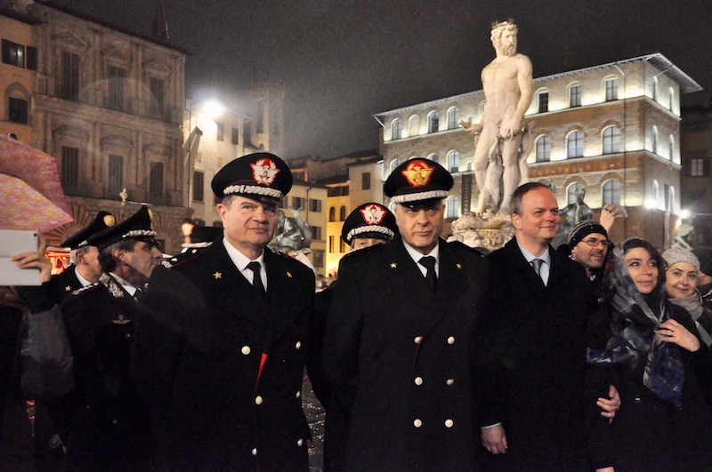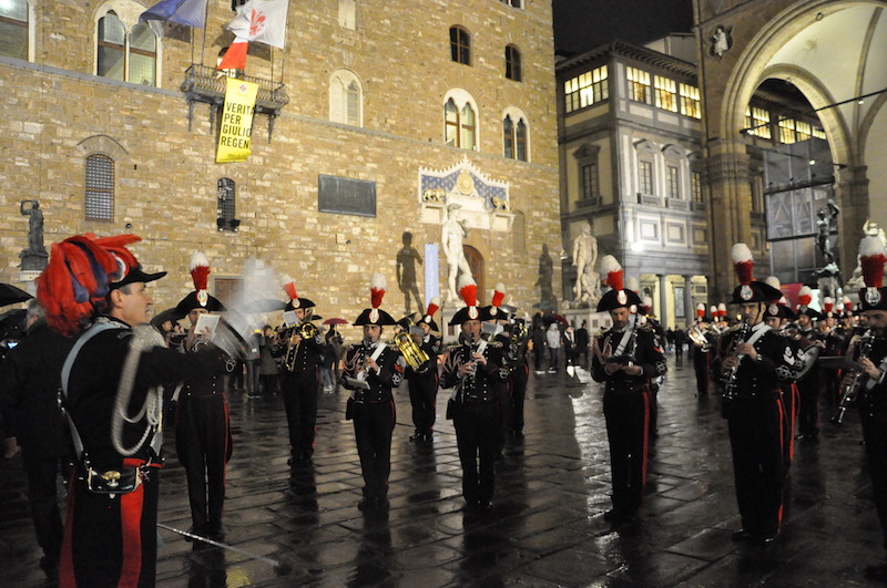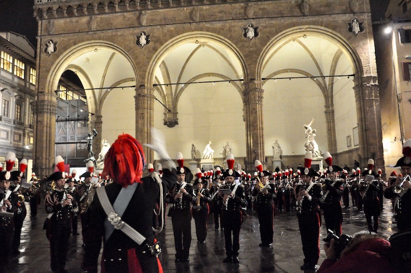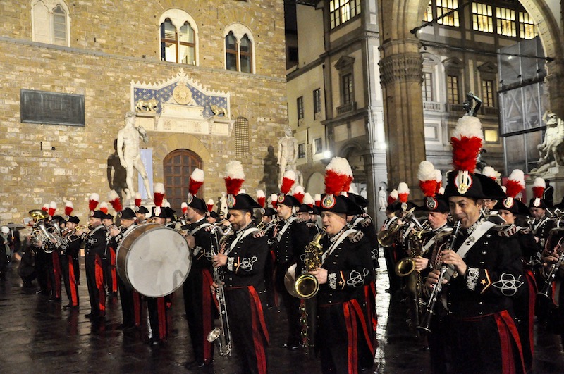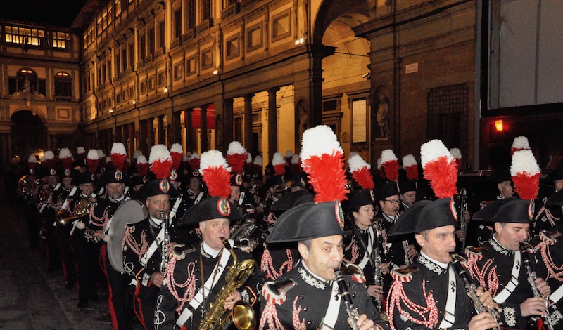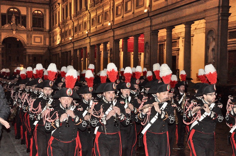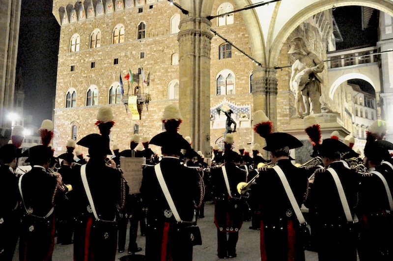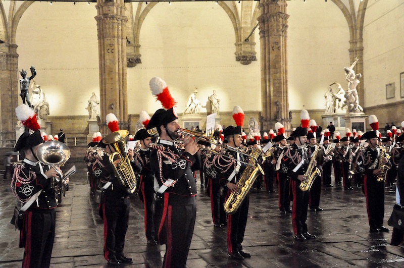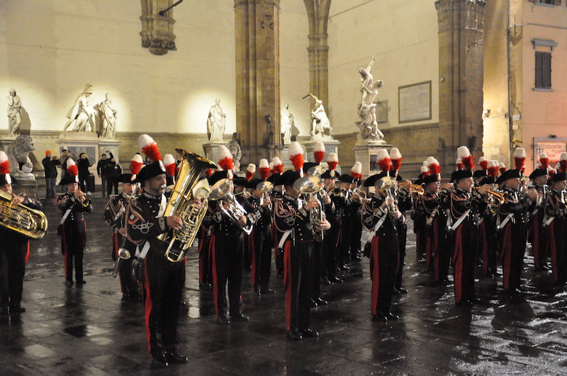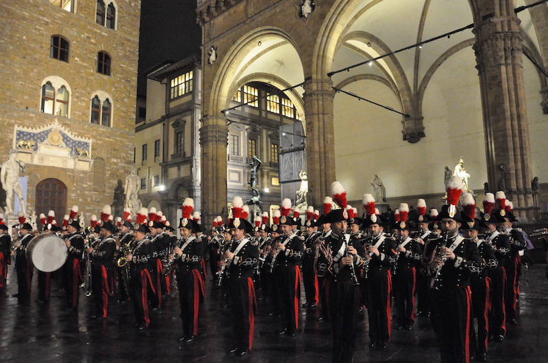 Nella serata prima nel loggiato degli Uffizi e quindi in piazza della Signoria sono echeggiate le note della Banda dell’Arma dei Carabinieri, diretta dal colonnello maestro Massimo Martinelli alla quale si è unita la Fanfara della Scuola Marescialli di Firenze che in precedenza aveva sfilato per le vie del centro cittadino, diretta dal maresciallo maestro Ennio Robbio.