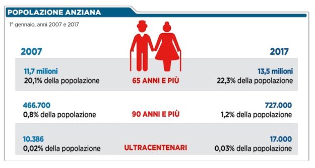 Età media: al 1° gennaio 2017 i residenti hanno un’età media di 44,9 anni, due decimi in più rispetto alla stessa data del 2016. Gli individui di 65 anni e più superano i 13,5 milioni e rappresentano il 22,3% della popolazione totale. Quelli di 80 anni e più sono 4,1 milioni, il 6,8% del totale, mentre gli ultranovantenni sono 727 mila, l’1,2% del totale. Gli ultracentenari ammontano a 17 mila. Nel 2007 quest’ultimi erano 10.386.