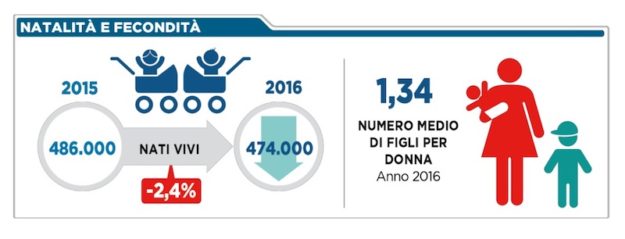 Fecondità totale: scende a 1,34 figli per donna (da 1,35 del 2015); ciò è dovuto al calo delle donne in età feconda per le italiane e al processo d’invecchiamento per le straniere. Le straniere hanno avuto in media 1,95 figli nel 2016 (contro 1,94 nel 2015). Le donne italiane sono rimaste sul valore del 2015 di 1,27 figli. L’età media delle donne al parto è di 31,7 anni.