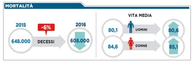 Vita media: per gli uomini raggiunge 80,6 anni (+0,5 sul 2015, +0,3 sul 2014), per le donne 85,1 anni (+0,5 e +0,1).