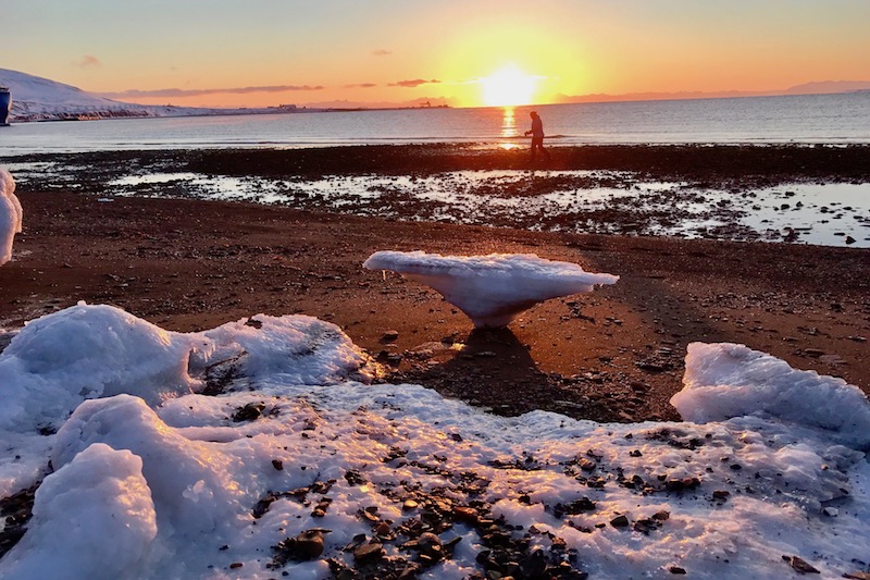 Ci si abitua presto a vedere il sole che non scende mai sotto l’orizzonte, tra i ghiacci di Spitzbergen. Anche se l’inverno volge al termine, il paese è ancora bianco. I pochi turisti radunati a Longyearbyen aspettano sulla spiaggia ancora ghiacciata.