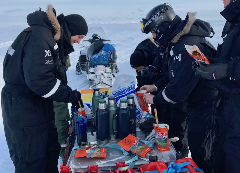 Dopo un giorno sulle slitte, troviamo rifugio in una capanna, nella zona di Foxdalen. Letti e sedute intorno al tavolo coincidono. La stufa a legna ammorba l’aria ma aprire le finestre non è una soluzione sempre praticabile. Per avere acqua basta andare fuori e tornare con un catino pieno di neve. Qualche minuto sopra la stufa la trasformerà in acqua bollente.