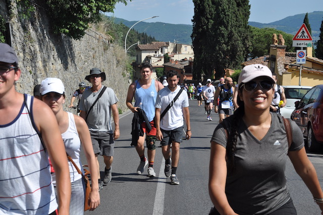 FIESOLE – Erano 2677 gli atleti alla partenza da Firenze per la 45ª edizione della «100 chilometri del Passatore 2017». Il via da piazza Strozzi intorno alle 15 di oggi sabato 27 maggio per una marcia ininterrotta fino a Faenza. Sulla prima impegnativa salita, quella di Fiesole, i primi atleti sono arrivati intorno alle 15.40. Una corsa lenta ma ininterrotta che ha visto competere partecipanti di ogni età e provenienza da ogni parte d’Italia. Un insieme di dialetti lungo chilometri ha echeggiato lungo tutta la strada panoramica, da Firenze a Fiesole. Molti i partecipanti che non hanno perso l’occasione di fare foto al panorama durante la corsa. Un attimo di fiato e un click ricordo.