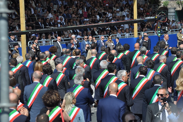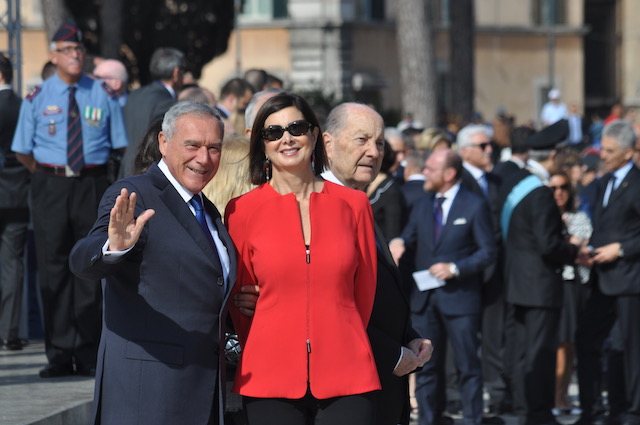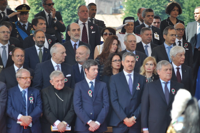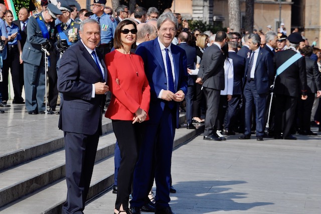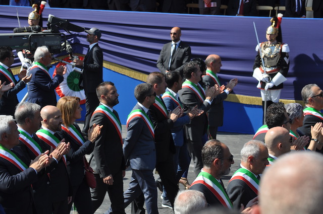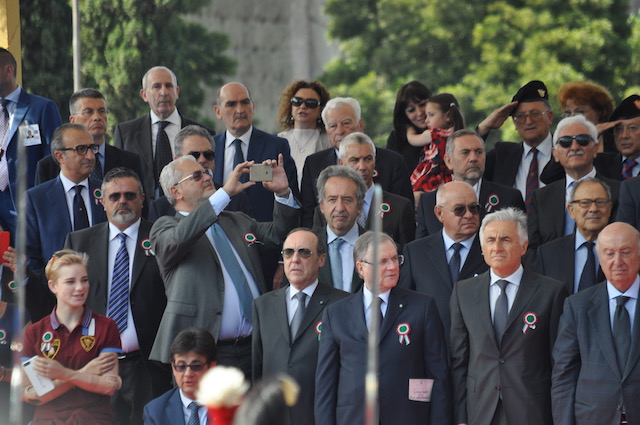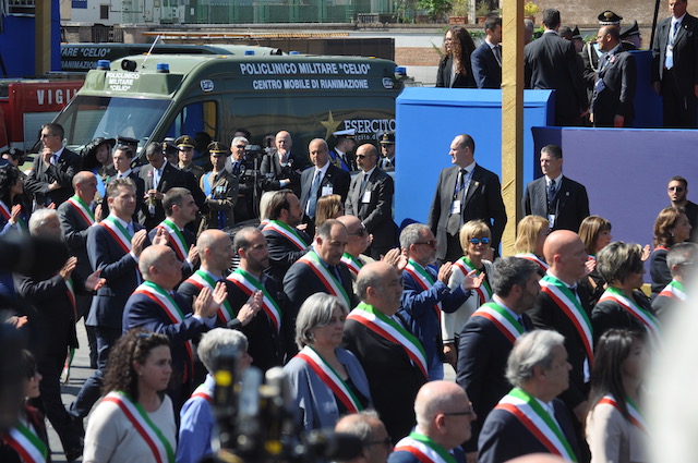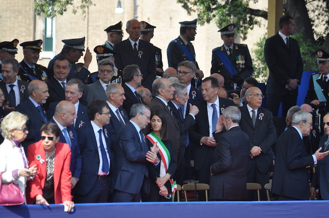 Molti occhi sono però anche puntati sulla tribuna presidenziale, quella dei Vip, gremitissima. Potervi prendere posto è un indiscutibile segno di distinzione, a cui pochi rinunciano. Con il presidente della Repubblica Sergio Mattarella, quello del Senato Pietro Grasso, della Camera Laura Boldrini e della Corte Costituzionale Paolo Grossi ci sono davvero tutti. O quasi. Il vero assente è Matteo Renzi, per tre anni continuativi presente sul palco (e sulla scena). Oggi non avrebbe titolo per esserci, dal momento che adesso è «solo» il segretario di un partito. Ma soprattutto avrebbe mal digerito un posto laterale e defilato in tribuna. E allora giustamente non si è fa vedere, magari per non rubare la scena ai rappresentanti delle Istituzioni.