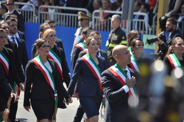 In tutto sfilano davanti al Presidente della Repubblica circa 4000 persone appartenenti ai corpi militari e civili. Con loro 159 Bandiere e Stendardi, 14 bande, 51 cavalli, 22 unità cinofile e 79 veicoli, tra i quali i mezzi impiegati nell’emergenza terremoto. Apre lo schieramento il generale di corpo d’armata dell’Esercito Agostino Biancafarina, capo del Comando di Roma Capitale. Gli occhi del pubblico sulle tribune dei Fori Imperiali sono tutti puntati sui reparti che partecipano alla parata, aperta dalla Banda centrale dei Carabinieri e da una rappresentanza di oltre 400 sindaci italiani con la fascia tricolore. In prima fila quelli dei Comuni del Centro Italia recentemente colpiti dal terremoto e dal maltempo. Seguono a breve anche il Gruppo Sportivo Paralimpico della Difesa e la Banda della Brigata Sassari, che esegue il celebre inno «Dimonios».