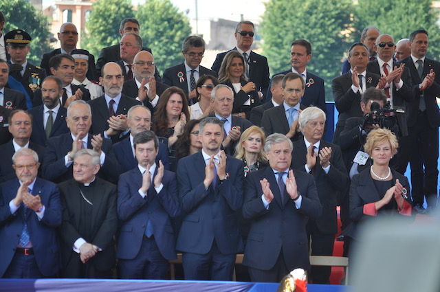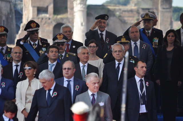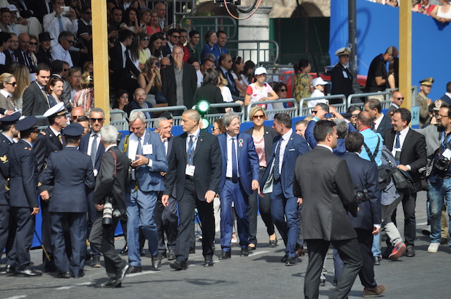 Del governo ci sono in particolare il presidente del Consiglio Paolo Gentiloni, la sottosegretaria Elena Boschi, i ministri Roberta Pinotti, Marco Minniti, Claudio De Vincenti, Andrea Orlando. Assenza di spicco quella del ministro degli esteri Angelino Alfano, sempre presente (specie da ministro dell’Interno) alla festa del 2 giugno. Presente il sindaco di Roma Virginia Raggi, che il rigido cerimoniale relega ad un posto laterale quasi al termine della prima fila. Molti gli ex ministri della Difesa presenti. Non solo lo stesso capo dello Stato Sergio Mattarella (già capo del dicastero della difesa dal 1999 al 2001) ma anche Antonio Martino, Arturo Parisi, Ignazio La Russa, Giampaolo Di Paola. Scontata la presenza di Antonio Tajani e Pierferdinando Casini. Meno scontata l’assenza di Massimo D’Alema, per anni visto in prima fila. Alla fine applausi per tutti i partecipanti. E un gran sospiro di sollievo per gli organizzatori, a cominciare dai responsabili della sicurezza.