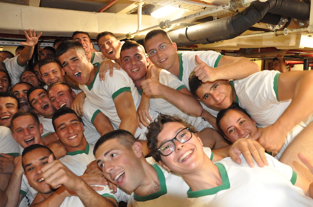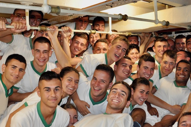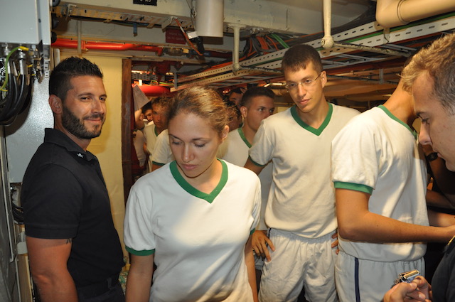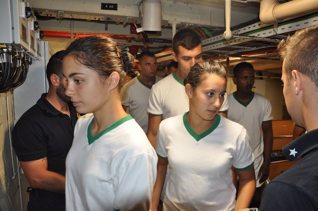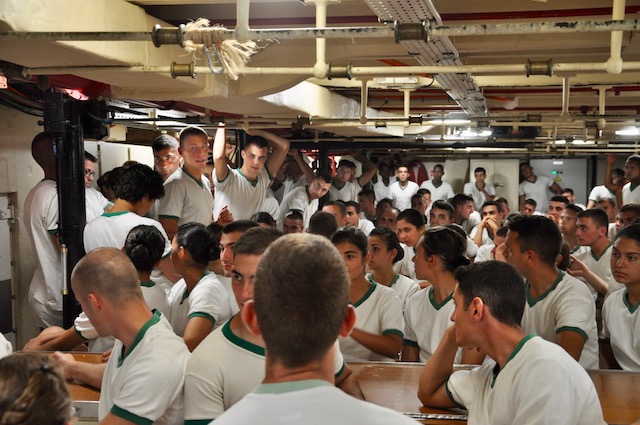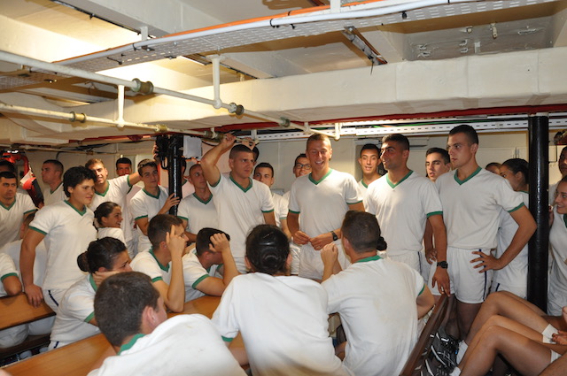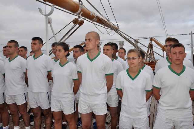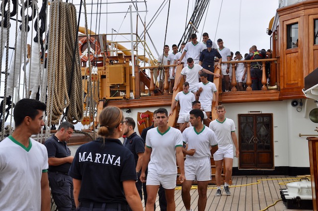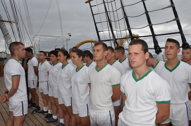 La prima riunione tra gli allievi è con il loro capo classe (tra due giorni si chiamerà ‘capo corso’), il 21enne Riccardo Fusaro di Vittorio Veneto. Ultime indicazioni, soprattutto di sopravvivenza per come affrontare il lungo ritiro, chiusi (dall’esterno) tutti insieme nell’unico locale in terza squadra. Tutti gli allievi sono già vestiti con maglietta e pantaloncini bianchi con bordo verde, l’unico abbigliamento in grado di sopravvivere a un conclave di questo tipo. Nella loro classe anche 15 allievi provenienti da paesi stranieri: 6 dal Kuwait, 2 da Gibuti, 1 rispettivamente da Albania, Algeria, Giordania, Perù, Somalia, Tunisia, Ucraina. Spuntano i primi applausi e qualche coro da stadio, davanti alle macchine fotografiche dell’equipaggio della nave. Sono le prove generali di quanto avverrà giovedì 31 agosto, al momento dell’uscita dal ritiro, quando grideranno all’oceano il nome del «loro» corso.