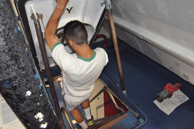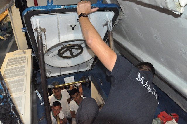 Verso le 10,30 si passa ai fatti. Gli allievi arrivano davanti al portellone della ‘terza squadra’ in fila indiana. Controlli minuziosi all’arrivo. Quelli negli aeroporti sono niente in confronto. È consentito solo un pacchetto di fazzoletti addosso. Nient’altro. Il primo maresciallo Luigi Lovecchio, capo quadrato del Reparto Accademia navale, chiude il portellone della ‘terza squadra’. È il momento del ‘fuori tutti’, come l’«extra omnes» del Conclave vaticano per l’elezione del Papa. Ora bisogna solo aspettare.