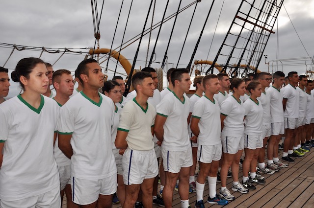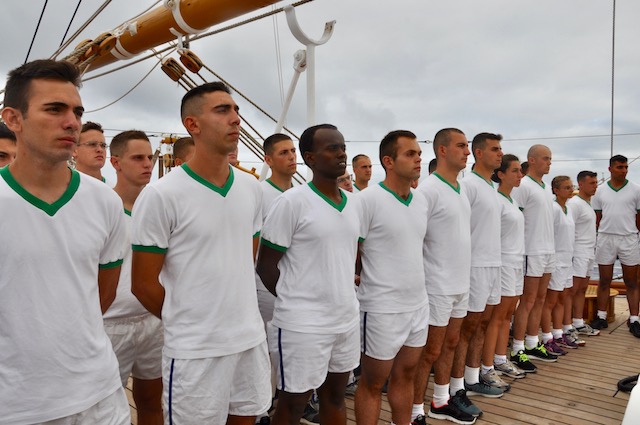 Sul ponte di castello del Vespucci, ultima assemblea pre-ritiro con il comandante Franceschino e lo staff del reparto Accademia navale, presente durante la campagna addestrativa sul Vespucci con 1 ufficiale superiore insegnante di nautica, 4 ufficiali «sottordini», 5 sottufficiali, 8 allievi «anziani» del 2° anno in veste di inquadratori. Questi ultimi sono gli stessi che lo scorso anno battezzarono sempre sul Vespucci, con la stessa emozione, il loro corso Ateires. Quest’anno, al rientro della campagna estiva in Italia il 23 settembre, diventeranno «aspiranti ufficiali». Lasceranno il ruolo di «anziani» ai più giovani colleghi di quest’anno. Che a loro volta non aspettano altro di passare il ruolo di «pivoli» ai neo allievi della prima classe 2017-2018, che hanno appena varcato i cancelli dell’Accademia Navale lo scorso 25 agosto.