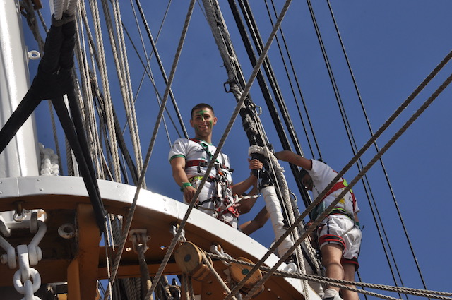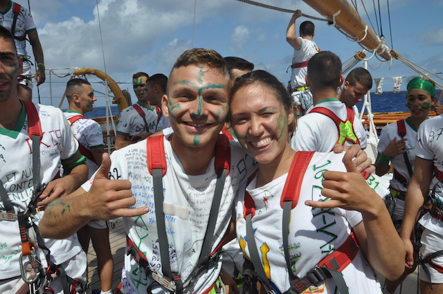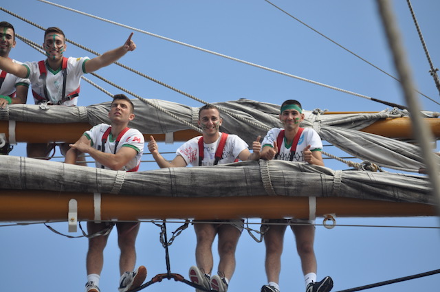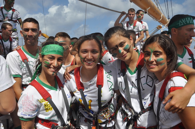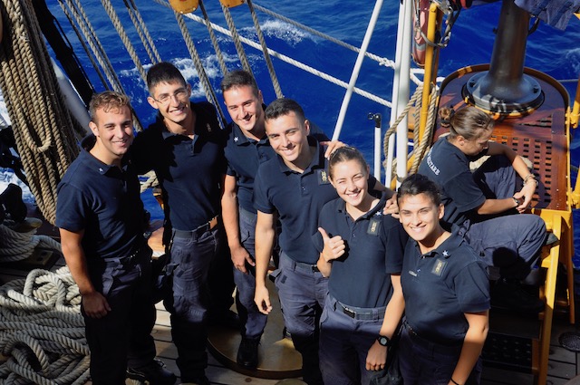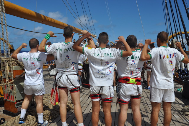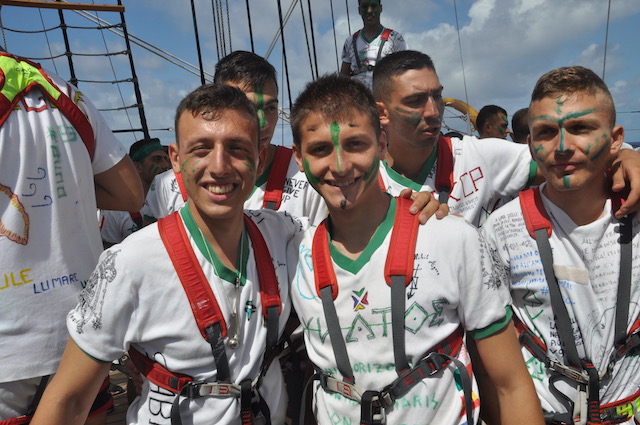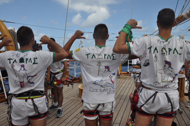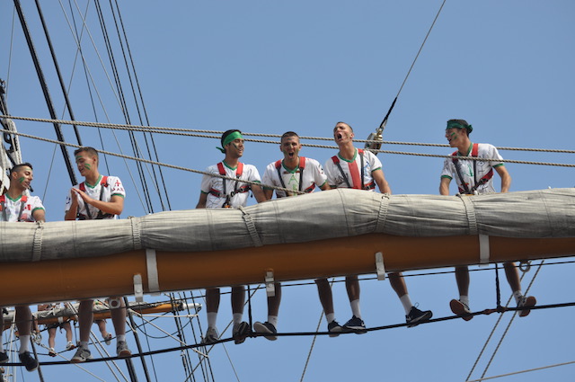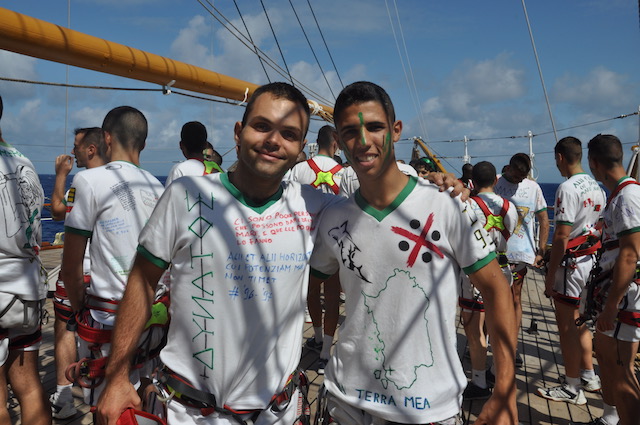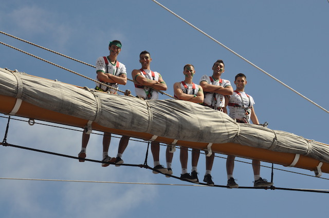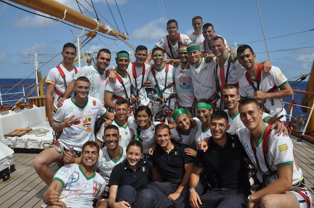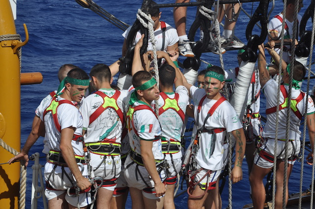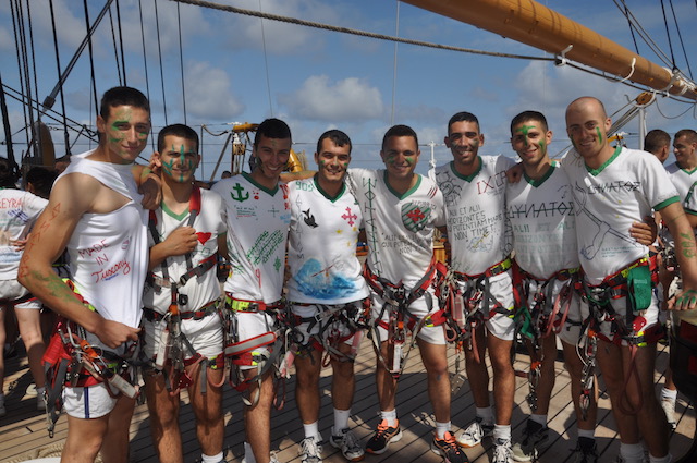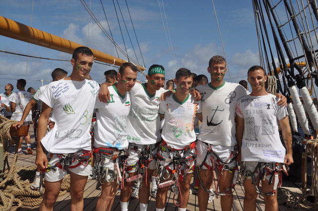 Tutto l’equipaggio della nave li osserva con partecipazione e un pizzico d’invidia. La squadra dei nocchieri non li perde di vista un momento, per seguire che tutta la manovra si svolga regolarmente. Il comandante Franceschino guarda in alto minuto per minuto i suoi ragazzi e alla fine si scioglie un grande sorriso, insieme al suo staff del Reparto Accademia Navale.