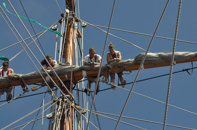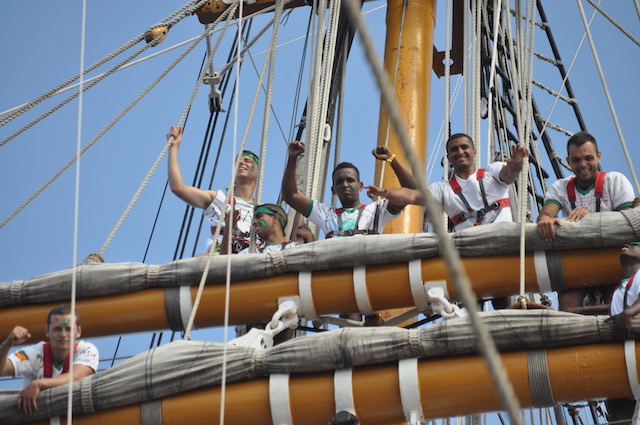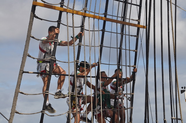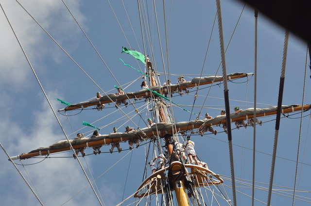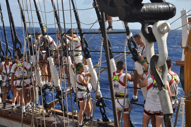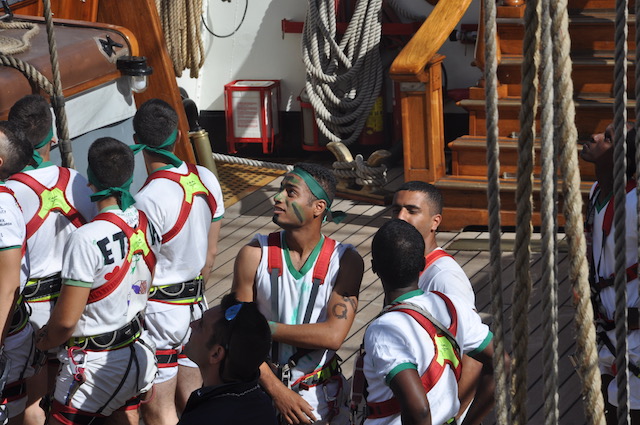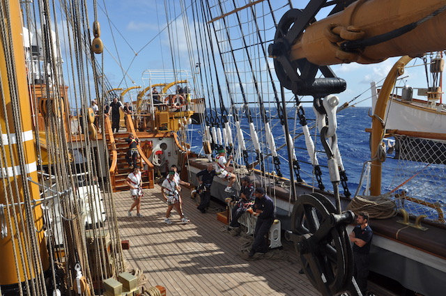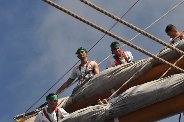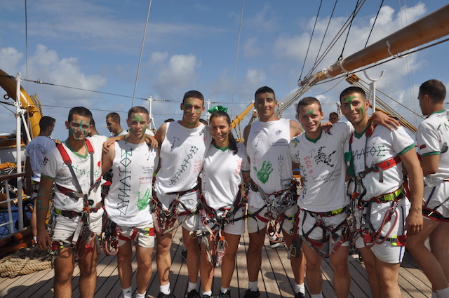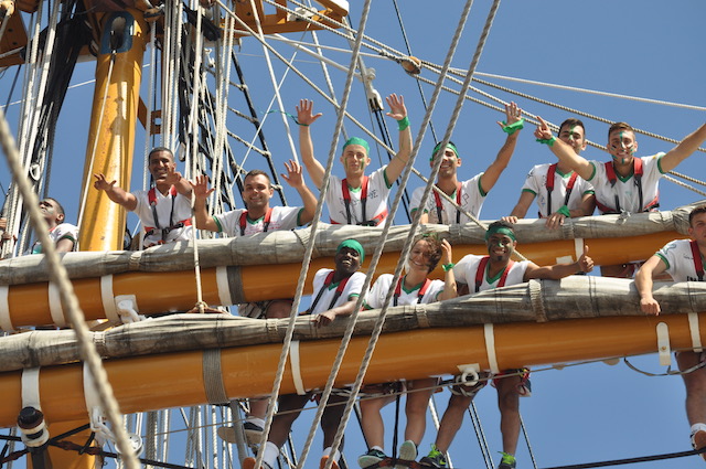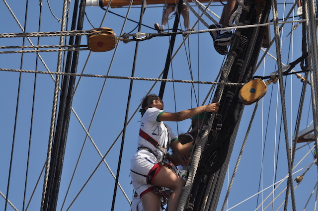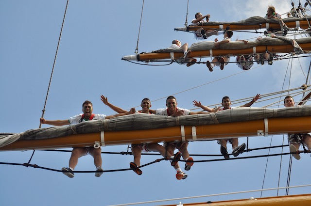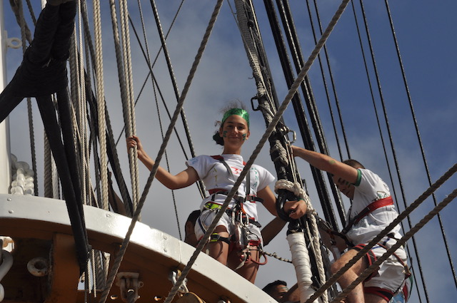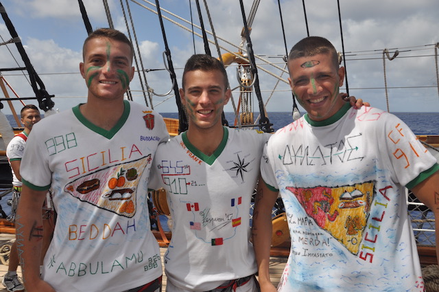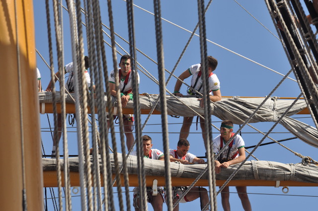Tutto l’equipaggio della nave li osserva con partecipazione e un pizzico d’invidia. La squadra dei nocchieri non li perde di vista un momento, per seguire che tutta la manovra si svolga regolarmente. Il comandante Franceschino guarda in alto minuto per minuto i suoi ragazzi e alla fine si scioglie un grande sorriso, insieme al suo staff del Reparto Accademia Navale.