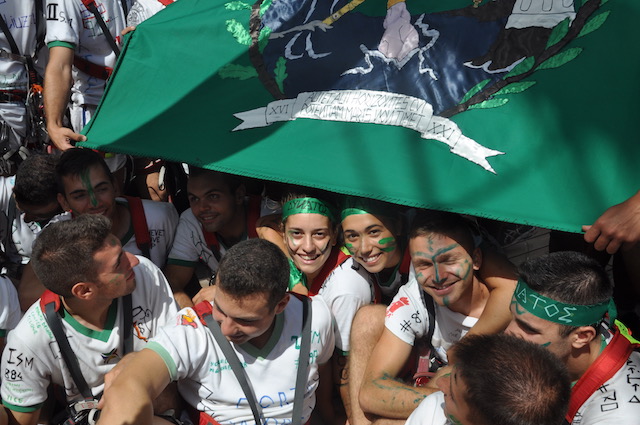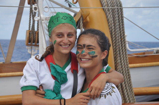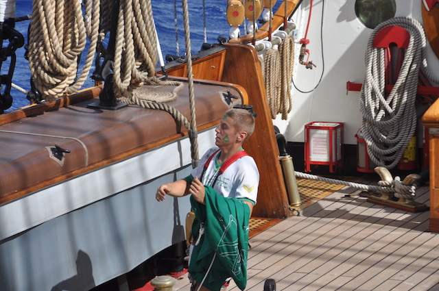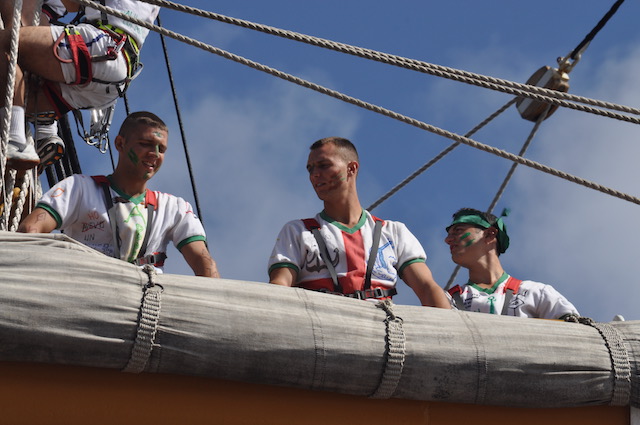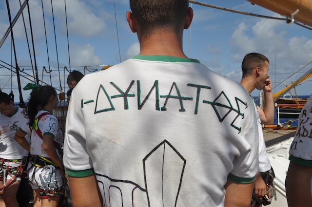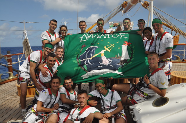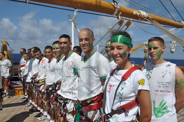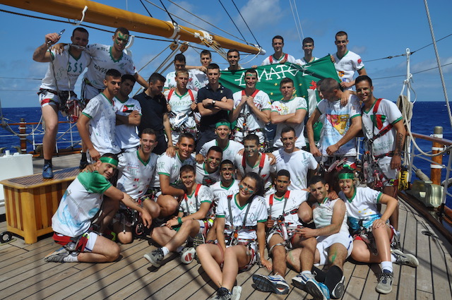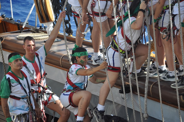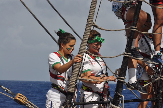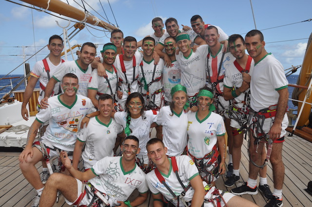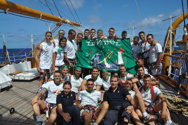 La grande corsa degli allievi del corso Dunatos verso gli alberi di Nave Vespucci scatta poco dopo le 10 del 31 agosto, quando in Italia sono le 12. La nave scuola è circa a metà strada tra le Azzorre e Cadice in Spagna, prossima tappa della campagna di addestramento 2017. Il primo a uscire dal «ritiro» (ribattezzato anche «conclave») è l’ex capo classe ora capo corso Riccardo Fusaro. Porta in mano la bandiera verde del Dunatos e si avvia, seguito dai suoi compagni, a «salire a riva». A salire, opportunamente protetto dai ganci di sicurezza, sull’albero di maestra, il più alto (54 metri) di Nave Vespucci. In poco tempo, nonostante il vento e il mare un po’ bizzarro ma che in quei momenti sembra calmarsi, tutti i 125 allievi sono sull’ «alberata». In piedi sui pennoni della «nave più bella del mondo».
