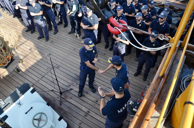Sul Vespucci non ci sono solo gli ‘ospiti’ imbarcati. C’è un equipaggio di circa 250 marinai. Il comandante Patruno usa un solo aggettivo per giudicarlo: «Meraviglioso». «È fatto – aggiunge – da persone che amano moltissimo questa nave. Solo così si riesce a presentare il Vespucci in Italia e all’estero, anche con la cura meticolosa nei particolari. Traspare l’amore per la nave e la cura del dettaglio. E ognuno sa di aver dato il proprio contributo personale a tutto questo».