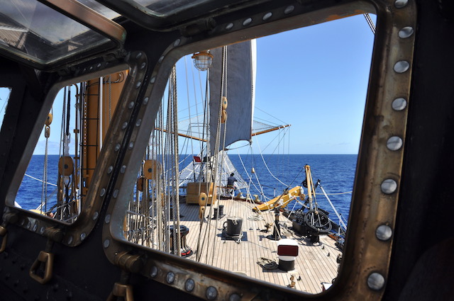 Il capitano di vascello Angelo Patruno è sulla plancia di Nave Vespucci, in navigazione nell’oceano Atlantico a circa 200 miglia dalla Spagna. Ha appena terminato la riunione mattutina con i suoi ufficiali e ascoltato gli aggiornamenti meteo, illustrati da un allievo dell’Accademia Navale. Il Vespucci sta rientrando verso l’Italia, dopo la campagna di addestramento 2017 che ha portato l’ammiraglia delle navi scuola della Marina in Nord America. Oltre 12 mila miglia, molte delle quali percorse a vela grazie al favore degli alisei all’andata e dei venti occidentali al ritorno. Non è mancato neppure un uragano, che il Vespucci è riuscito a lasciarsi tempestivamente alle spalle.