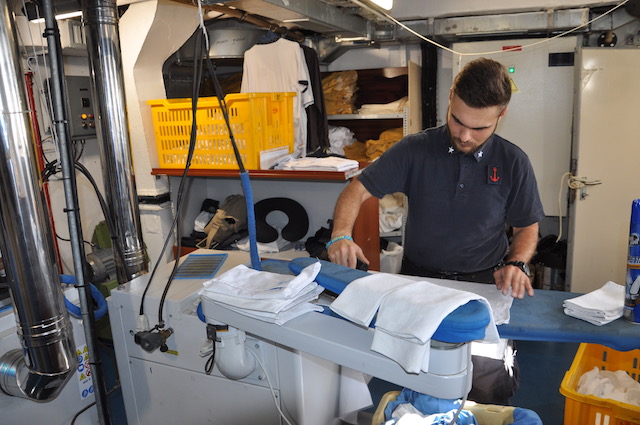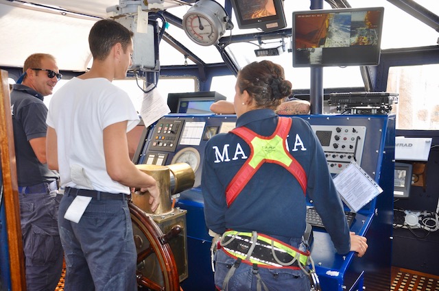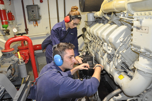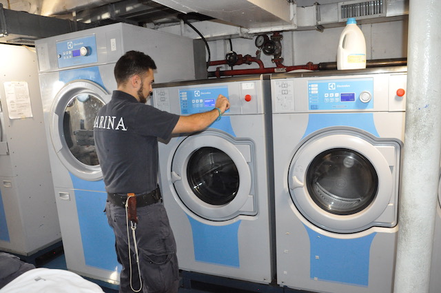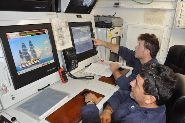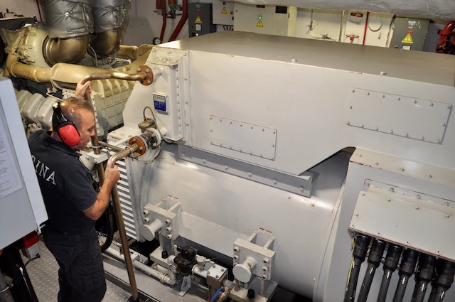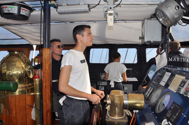 Ogni ora c’è un giro di ronda nella sala macchine, tra generatori diesel, motori di propulsione, asse dell’elica. Se quest’ultima si bloccasse il Vespucci dovrebbe fare affidamento solo sulle sue vele. Navigazione suggestiva, velocità a parte, a condizione che ci sia il vento e per di più favorevole. Condizioni non sempre scontate. Per questo dei marinari del sistema nave c’è sempre bisogno.