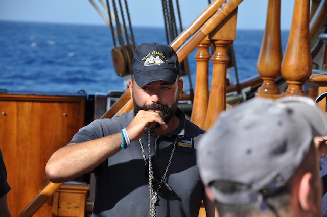 Uomo chiave dell’equipaggio è il cappellano don Pietro Folino Gallo, 36 anni. Da buon calabrese non gli manca tenacia e costanza nel perseguire la sua missione. Con discrezione ma puntando sempre all’obiettivo, assicura chi lo conosce bene. È a bordo del Vespucci in qualità di cappellano dell’Accademia Navale di Livorno e come tale è particolarmente vicino ai 125 allievi della prima classe. È il tramite spirituale con i loro comandanti. Più facile spesso confidarsi con il cappellano che con un comandante. Don Pietro li conosce uno per uno e riesce a non perderli mai di vista, anche quando sembra impegnato in altre occupazioni.