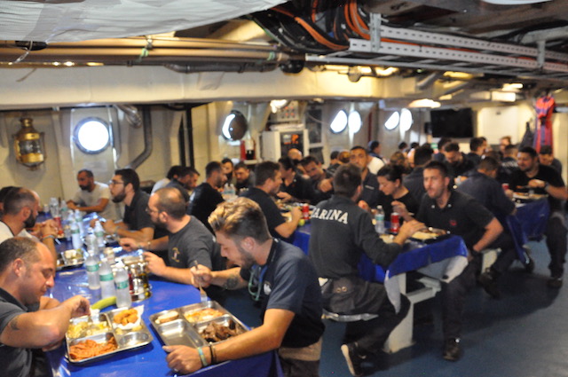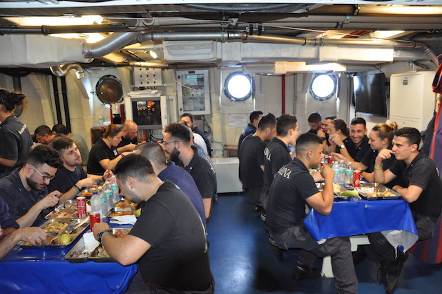 Durante la giornata poi è frequente rivolgersi a lui per un conforto o un semplice scambio di una parola. Non solo con i «suoi» allievi ma anche con l’equipaggio permanente della nave. L’obiettivo di un cappellano? «Prima di tutto la formazione umana di questi giovani – risponde guardandoti come sempre negli occhi – poi se da parte loro c’è la fede ancora meglio. Non sono qui per essere il confessore per i credenti e un estraneo per i non credenti. Qui c’è posto per tutti». Un sorriso e scende sotto coperta, dopo che l’altoparlante di bordo ha appena annunciato: «Tra 5 minuti ha inizio la Santa Messa nel camerino nel cappellano». Non è frequentatissima quella serale di ogni giorno, ma non è questo un problema.