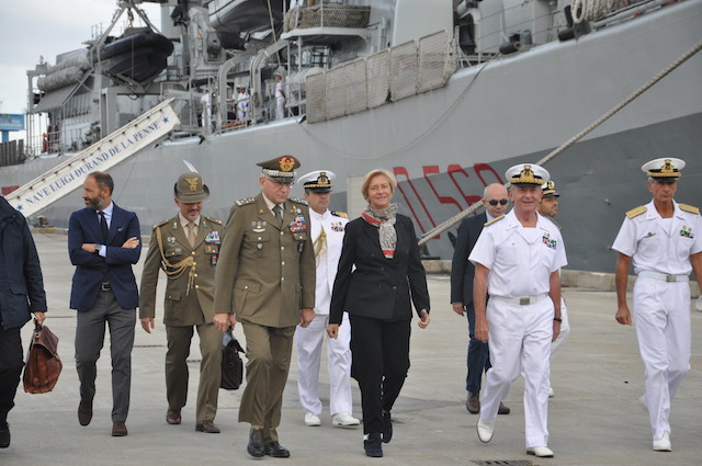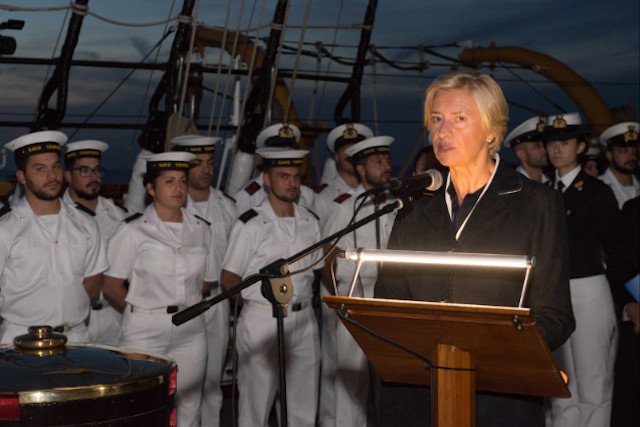 Alle 8,30 scende dal Vespucci il ministro della Difesa Roberta Pinotti, accompagnata dal capo di Stato Maggiore della Difesa Claudio Graziano e della Marina Valter Girardelli. Avevano raggiunto le unità nella giornata di ieri, venerdì 22 settembre, nelle acque di Portoferraio all’isola d’Elba, tradizionale appuntamento delle navi scuola della Marina al loro rientro a Livorno al termine delle campagne di istruzione.