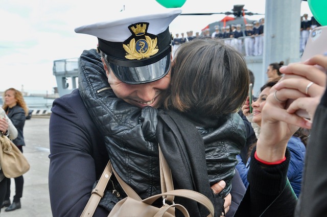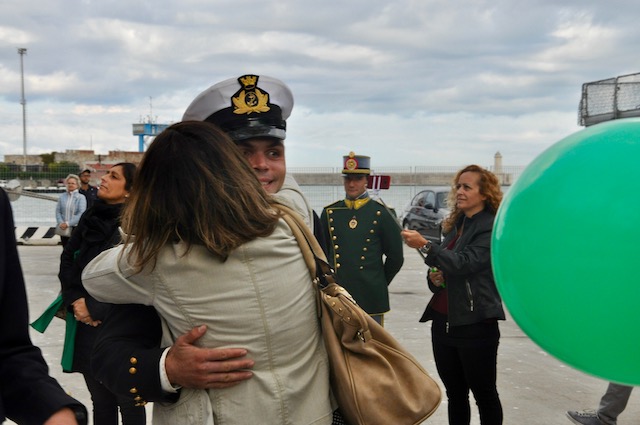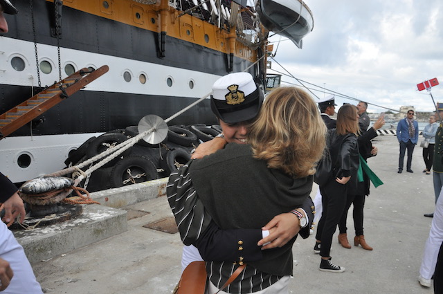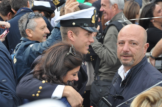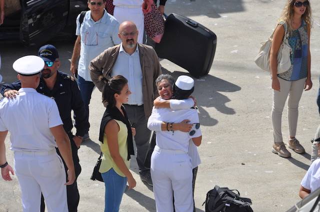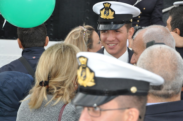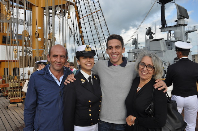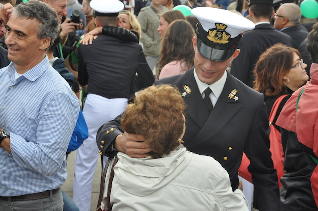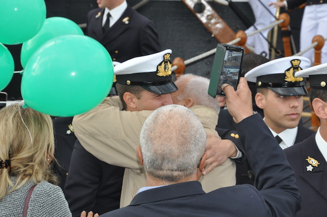 Negli stessi momenti in porto viene dato il «via libera» ai familiari che hanno potuto finalmente avvicinarsi alle navi Vespucci e Durand de la Penne. I sorrisi e gli abbracci riescono ad avere la meglio sulla commozione e qualche lacrima, non solo tra i familiari ma anche nel marinaio più abituato alla durezza della navigazione, tra vele, vento e mare mosso. Segue un giro a bordo del Vespucci per tanti genitori, nonni, fratelli e sorelle accompagnati dalla «loro» guida personale, che mostra con orgoglio i luoghi dove ha passato molte settimane, tra studio, guardie e addestramento alle vele. Adesso c’è una sola settimana di licenza. Lunedì 2 ottobre ricominciano le lezioni in Accademia. Con il ricordo dell’esperienza sul Vespucci appena conclusa, il ritorno sarà più facile.
