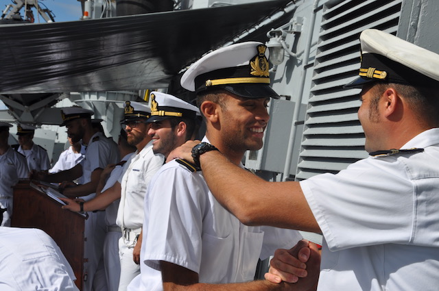 LIVORNO – Nave Vespucci ore 10,31: «È il comandante che parla. Oggi 23 settembre cessa la campagna d’istruzione 2017. Da questo momento inizia la franchigia». Via libera alla licenza, per chi può. Un (quasi fragoroso) applauso accoglie le parole del capitano di vascello Angelo Patruno, da bordo di Nave Vespucci arrivata a Livorno dopo cinque mesi di navigazione in Atlantico e Nord America. A bordo ci sono gli allievi dell’Accademia Navale (corso Dunatos) che da appena due giorni hanno ottenuto la sospirata mostrina «2» del secondo anno. Ora sono gli «anziani» rispetto ai colleghi più giovani che a fine agosto hanno appena iniziato il 1° anno 2017-2018.