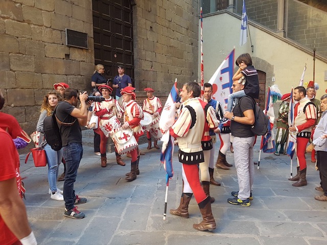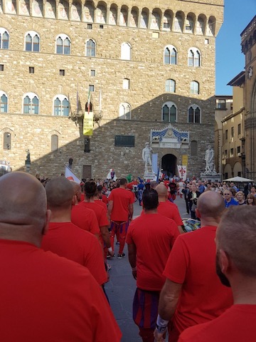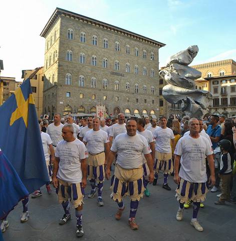La manifestazione è stata aperta da un corteo dei calcianti che si è mosso dalla piazza di Parte Guelfa, dove sorge lo storico «Palagio», per raggiungere piazza Poggi attraverso le strade del centro storico fiorentino, in mezzo alla folla incuriosita e divertita. La partenza comune dal Palagio ha un preciso significato. La coincidenza storica vede che nella piazza del Palagio non ci sia solo l’attuale sede del Calcio Storico Fiorentino. Negli stessi luoghi c’è stata anche la caserma dell’allora «Corpo dei pompieri di Firenze» dalla fine dell’800 al 1921, prima del trasferimento nell’attuale caserma di via La Farina.