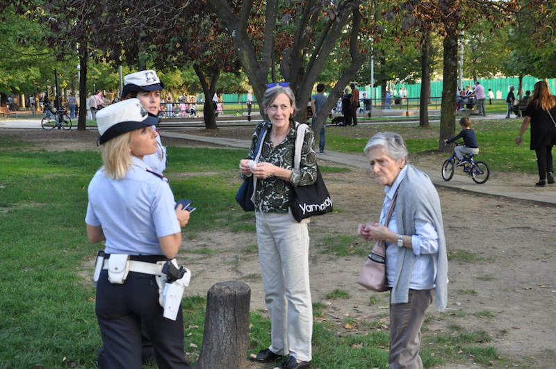 Ore 17.10 viale Malta e giardini del Campo di Marte. Due vigilesse stazionano prima davanti alla piscina Costoli, quindi si portano (come si dice nel linguaggio radio) presso i giardini dietro la curva Fiesole dello Stadio. Sono appena arrivate, con il loro security point mobile (che non è altro che la loro auto di servizio), dal giardino di Bellariva in piazza Rosadi. I loro taccuini sono pieni di annotazioni. La gente è venuta incontro con i suoi mille problemi di tutti i giorni, ma anche con richieste e segnalazioni che non riguardassero solo il classico paio di metri quadrati davanti alla porta di casa. Le piccole emergenze si risolvono sul posto, come quella di un cane che era rimasto incastrato nei pressi di una panchina. Per le altre si richiede via radio un intervento più specialistico.