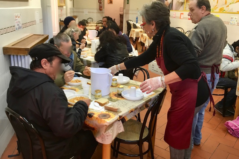 I volontari della Caritas sono pronti a servire a tavola. Il loro turno è di circa due ore, un giorno alla settimana. Impegno più gravoso per chi lavora e deve chiedere due ore di permesso per raggiungere la Caritas. «Si corre, ma vince la soddisfazione di sentirsi utili a chi ha bisogno» è la risposta unanime. Dalla signora di quella che si chiamerebbe la «buona borghesia» che non si lesina a mettersi il grembiule, servire a tavola e pulire per terra. Dall’impiegata di uno studio commerciale a quella di un consulente del lavoro, che devono tornare presto in ufficio. Ma anche ad un distinto signore americano, ormai fiorentino di adozione, che non ha problemi a passare tra i tavoli e mettersi a disposizione degli altri.